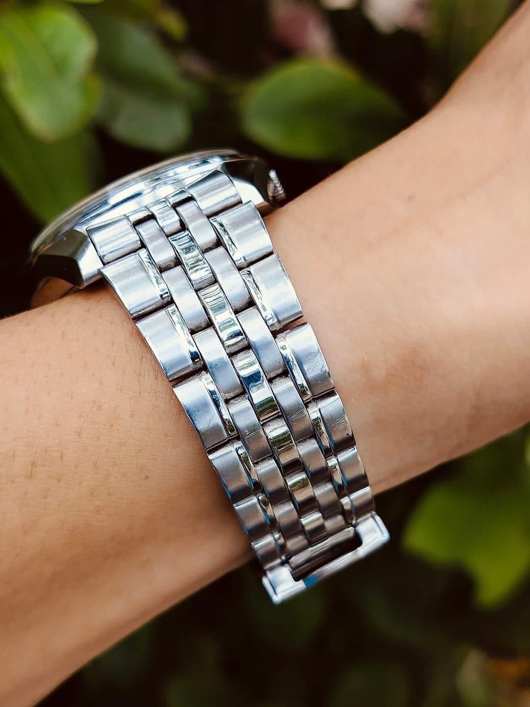 A vintage Seiko watch with a silver dial and a silver bracelet. The watch is in good condition and is a great addition to any collection. The watch is automatic and has a date function.