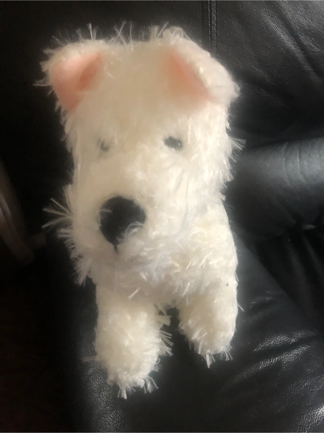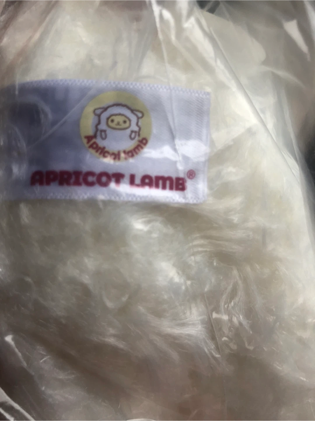 It's a cute white fluffy Lama plushie! Soft and huggable, it's perfect for cuddling. Made with fuzzy material, it has a black nose and pink inner ears. Great for kids!