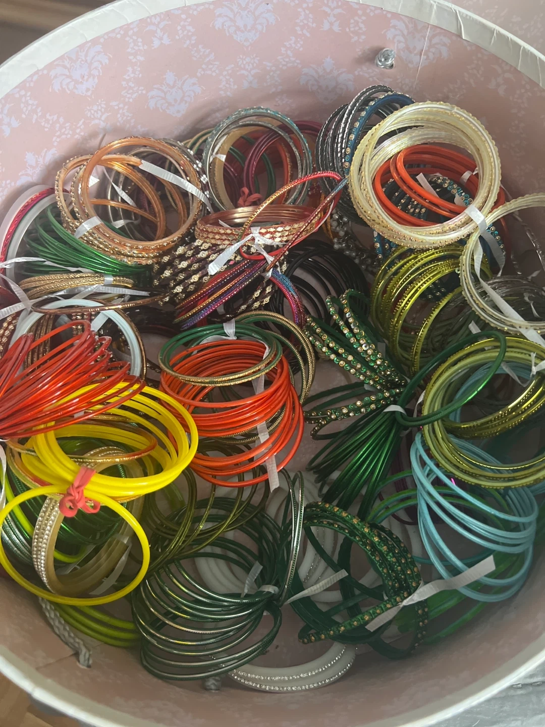 Selling a box filled with colourful bangles! There's a variety of colours and designs, perfect for adding a pop to any outfit. Great for parties, special occasions, or just everyday wear( everything for $10)