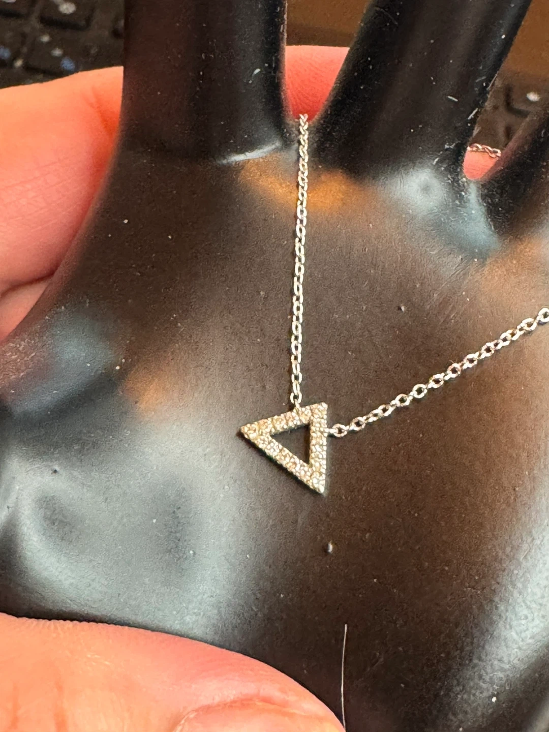 Selling a delicate triangle diamond necklace! It's a simple and elegant piece that would be a great addition to any jewelry collection. perfect for layering and everyday use.