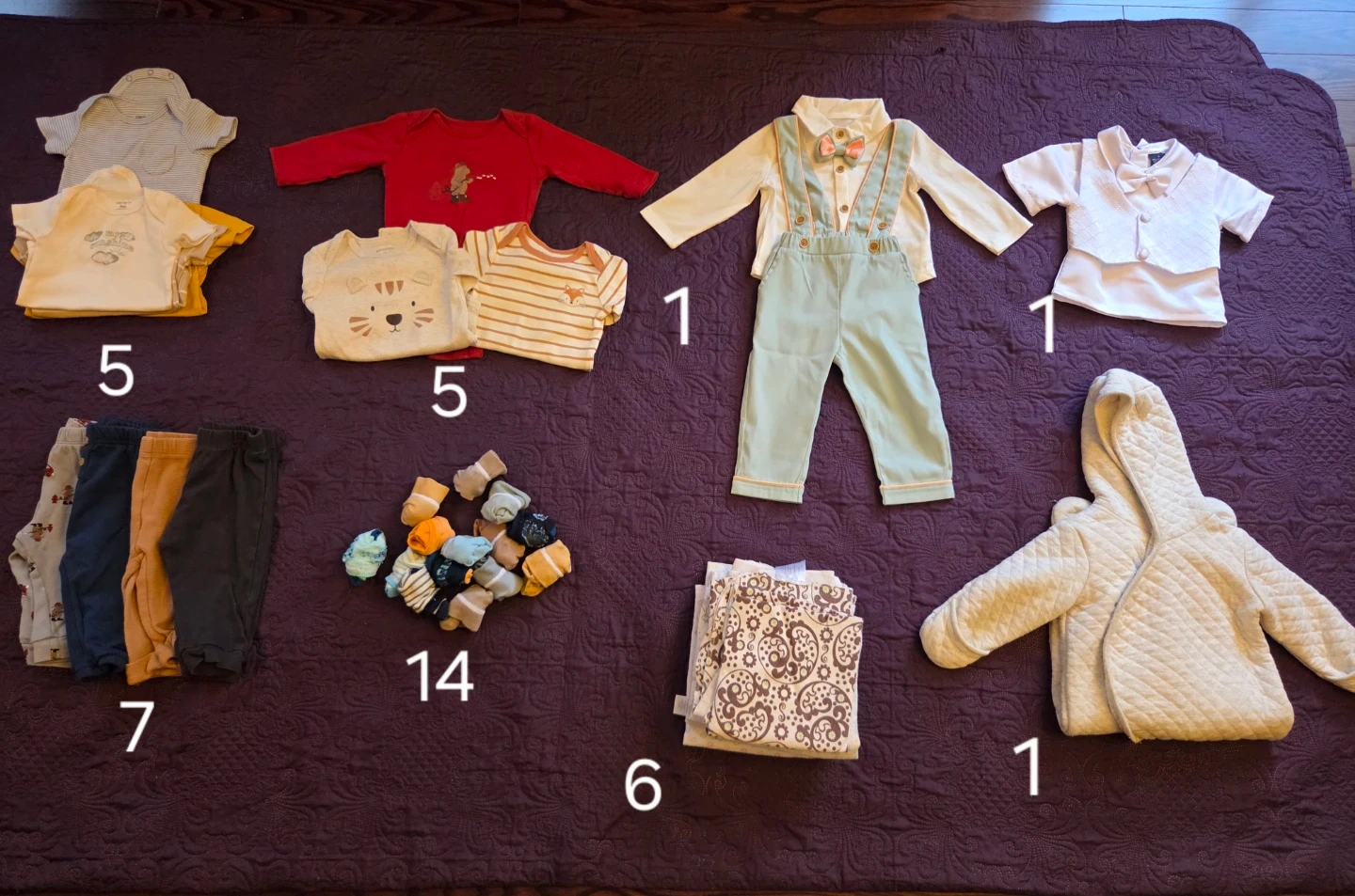 Baby 9 months clothes, are in good condition. Socks, pijamas, coats, 2 shorts, t-shirt, pants, a set of jacket and pant, blankets and a winter coat.
