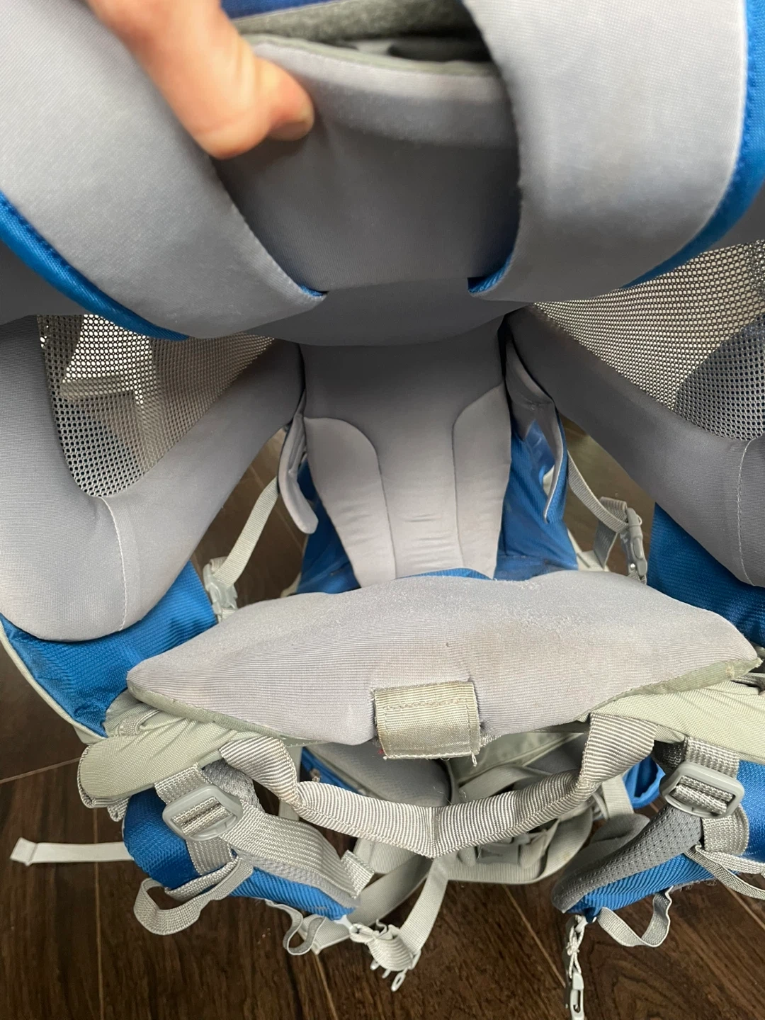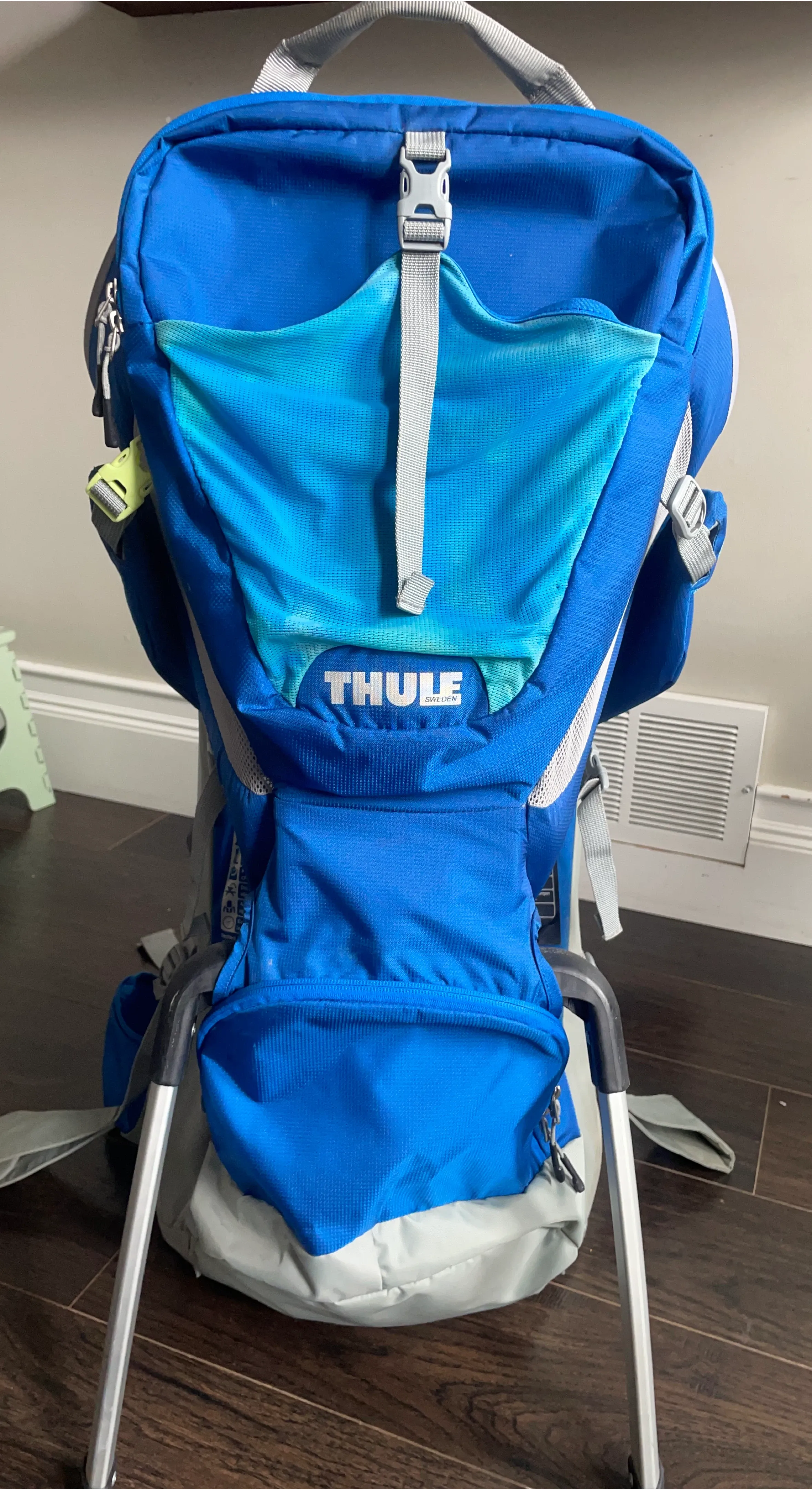This Thule Sapling child carrier is designed for comfortable outdoor adventures. It features adjustable straps for a custom fit. Includes original instructions for easy setup. Perfect for parents on the go! Cosmetic issues only- see discolouration of meshing, some light staining on inside/top, small markings. Fully functional, all straps/zippers in good condition.