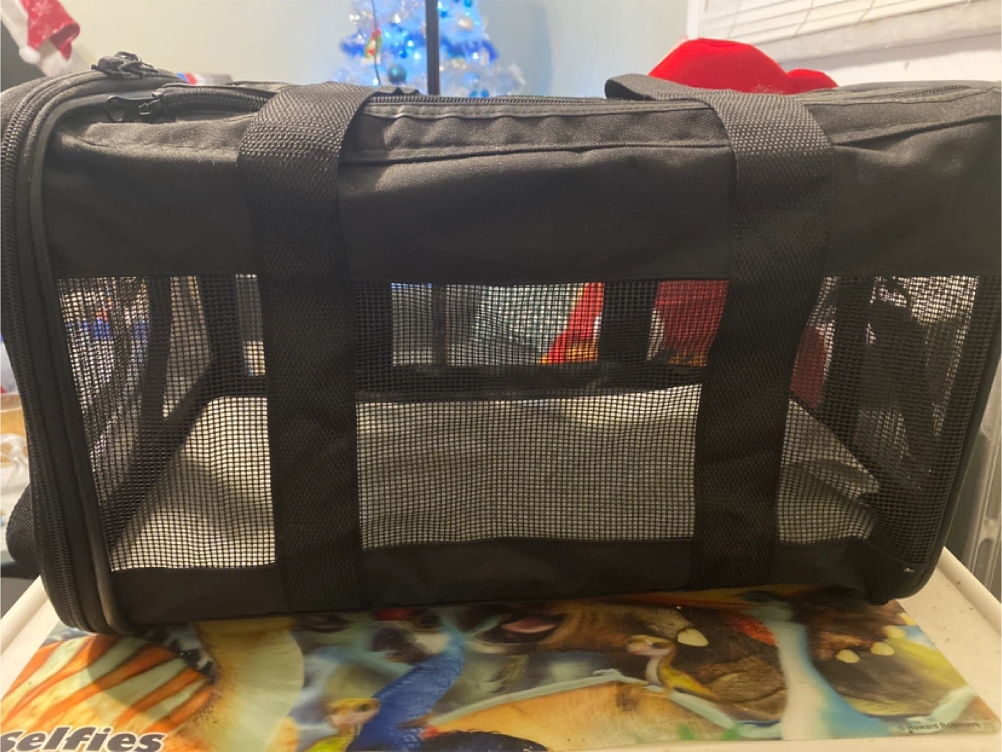 This is a black pet carrier bag with mesh windows for ventilation. It has sturdy handles for easy carrying. Suitable for small pets on the go!