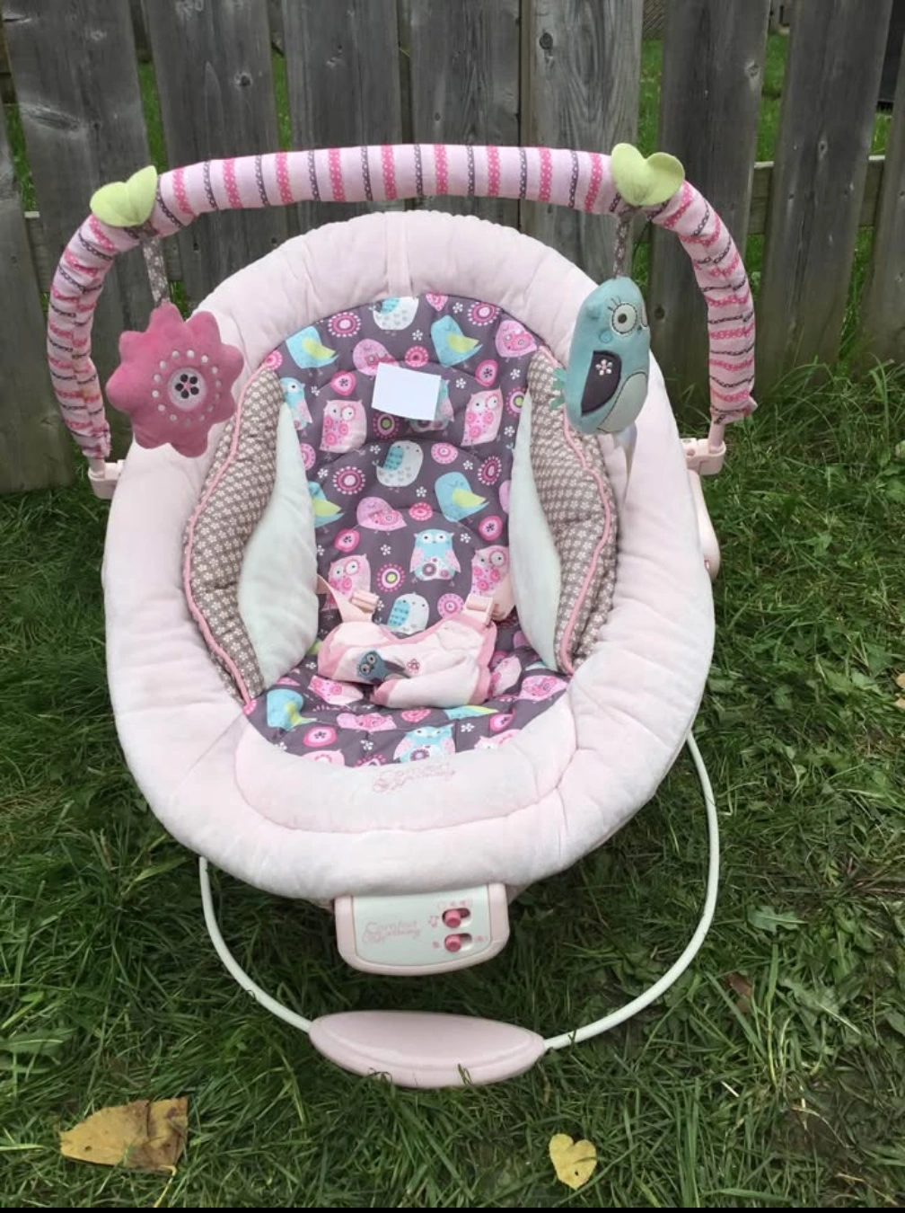 Comfort & Harmony brand baby bouncer. Pink and grey owl design. Features a removable toy bar with plush toys. Plays music and has vibration.Gently used.