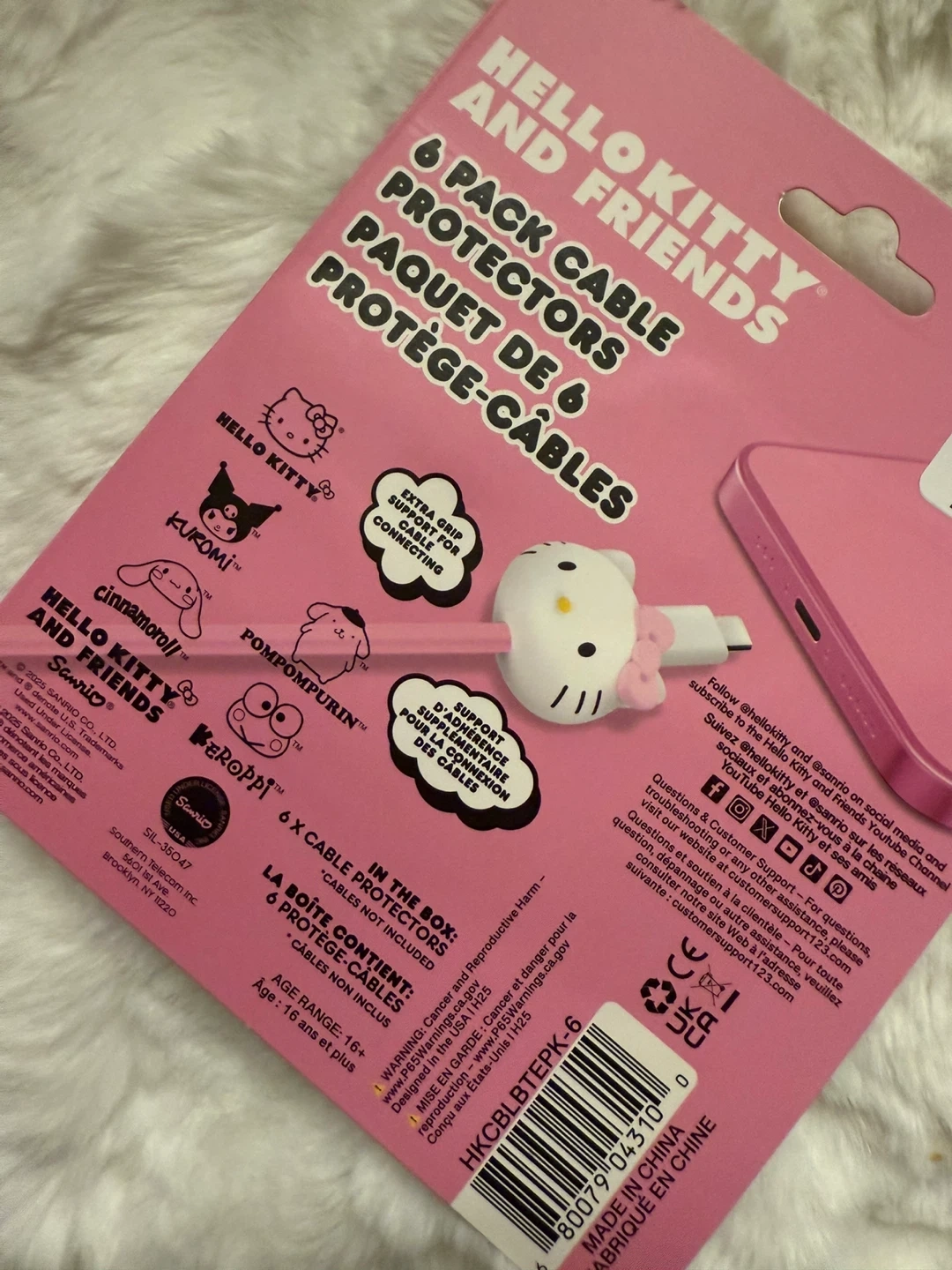 Keep your charging cables safe and stylish with this Hello Kitty and Friends 6-pack of cable protectors! These adorable protectors feature Hello Kitty, Kuromi, Cinnamoroll, Pompompurin, and Keroppi. They fit most cables and prevent cable wear and tear