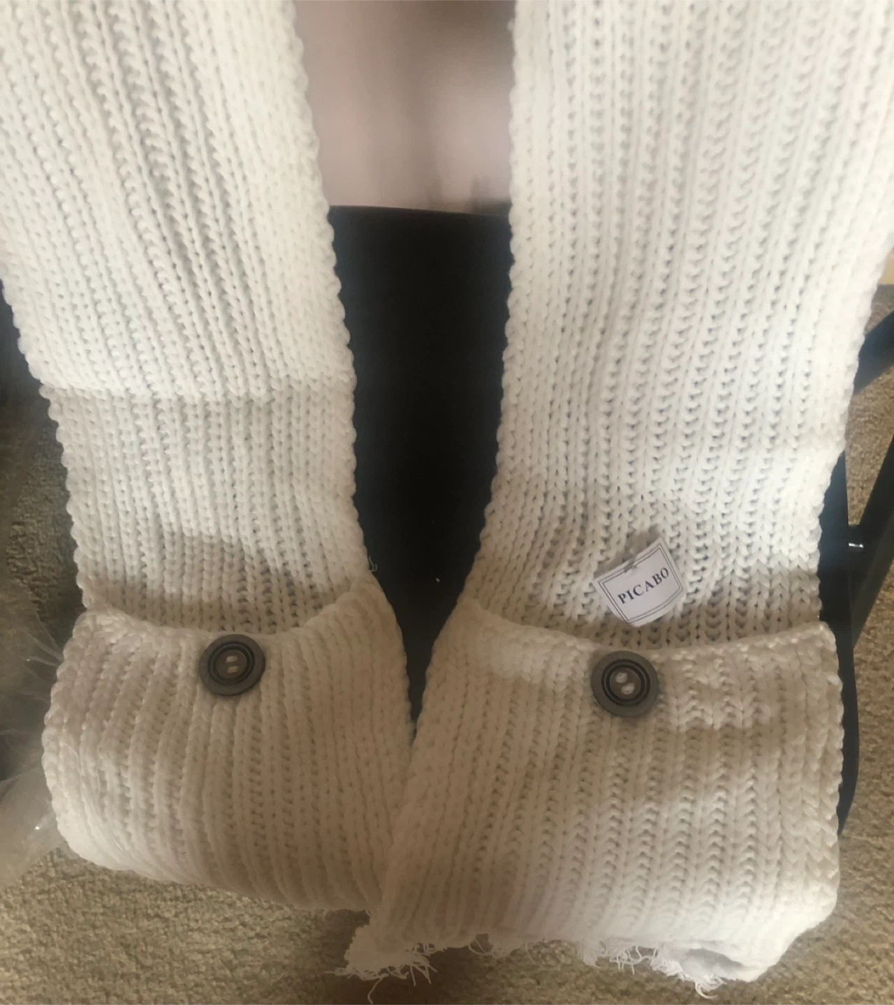 Cozy up with this Picaro knit scarf! It's a lovely white colour and features handy pockets on each end and cap Perfect for keeping your hands warm on chilly days