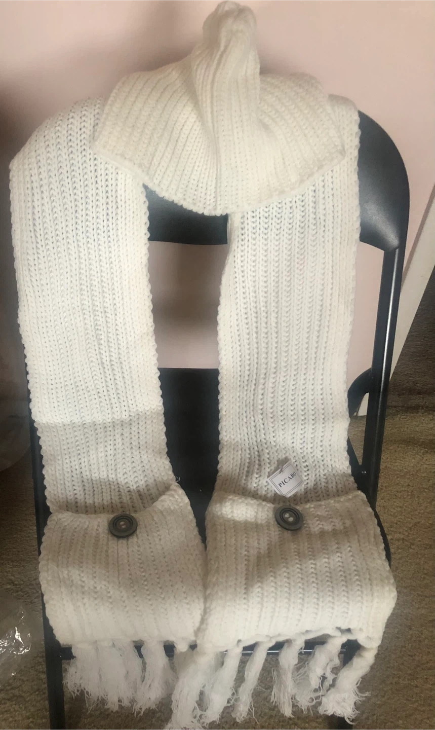 Cozy up with this Picaro knit scarf! It's a lovely white colour and features handy pockets on each end and cap Perfect for keeping your hands warm on chilly days