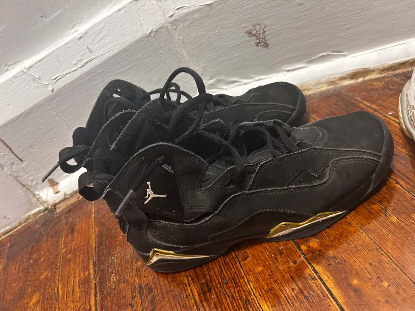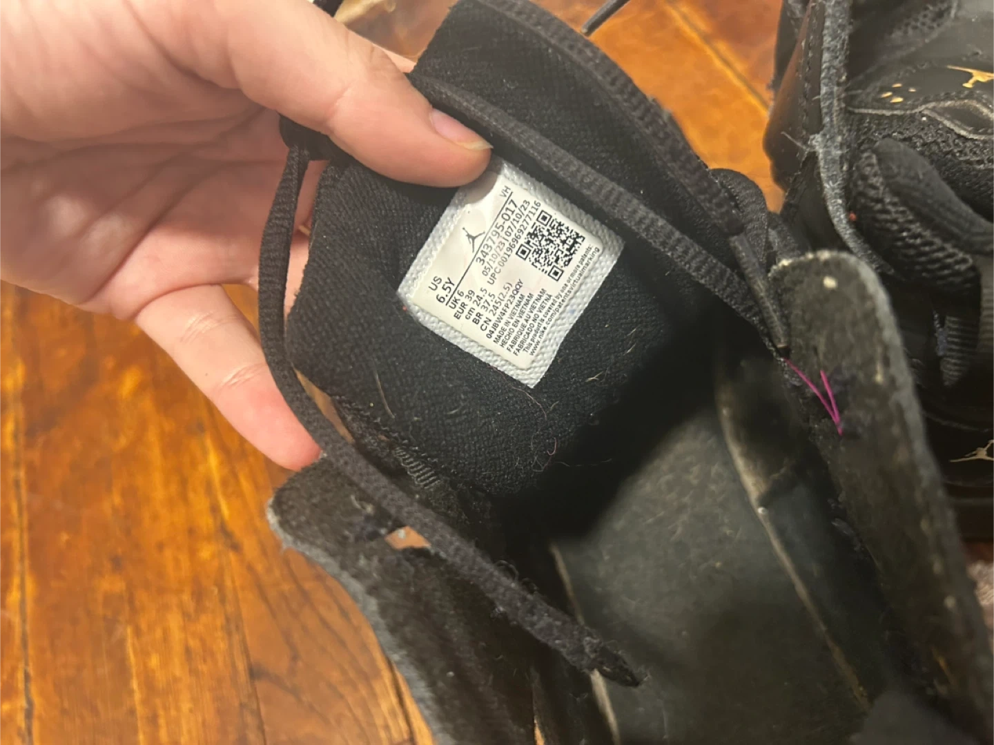 Selling a pair of Jordan shoes in black and gold. They are size 6.5Y. Please see photos for condition!
