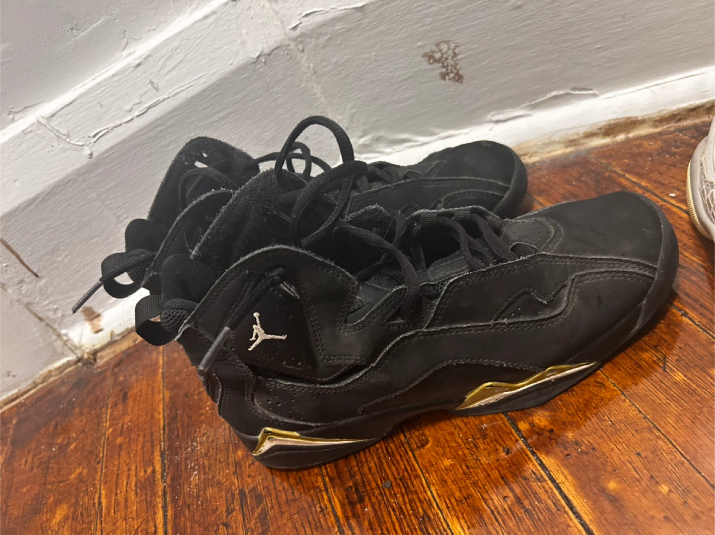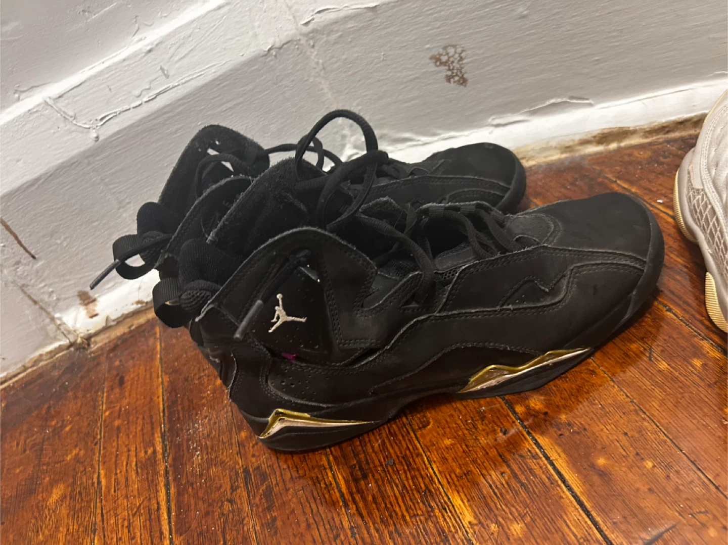 Selling a pair of Jordan shoes in black and gold. They are size 6.5Y. Please see photos for condition!