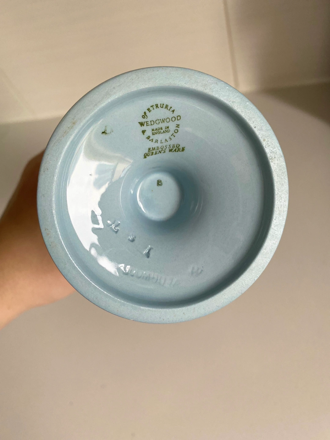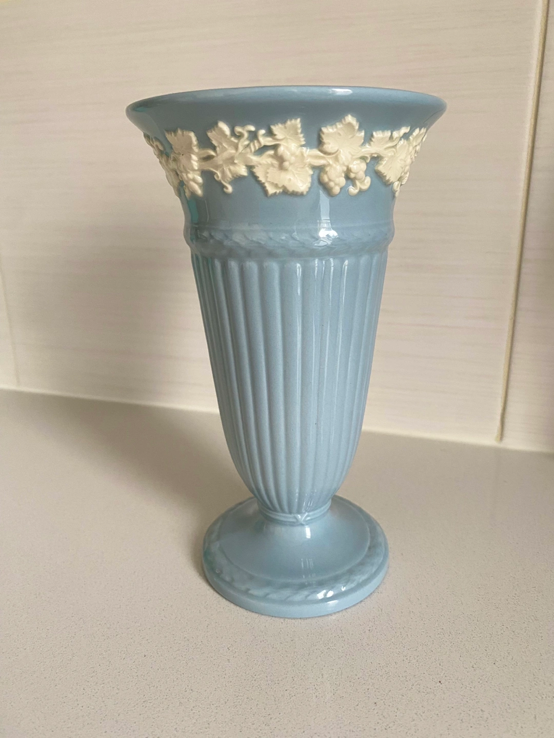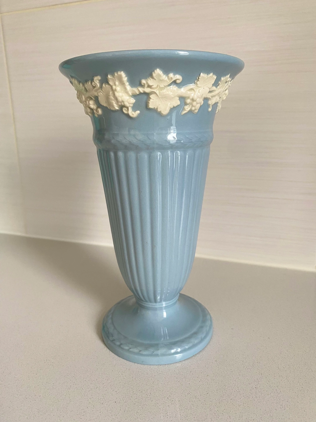 A rare piece for your collection! Vintage Wedgwood trumpet vase. Embossed Queen's ware, 6.5" tall, ceramic footed vase. Colour is "powder blue" with white grape vines. Made in the 1940s (based on the logo).