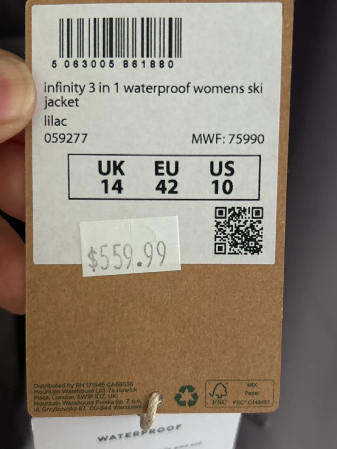 π₯ This Mountain Warehouse Infinity 3-in-1 ski jacket is waterproof and comes in lilac. It's a women's ski jacket with UK size US 10 sizing. It features warm and extra warm thermal rating. This jacket is perfect for staying protected from the elements during winter sports.