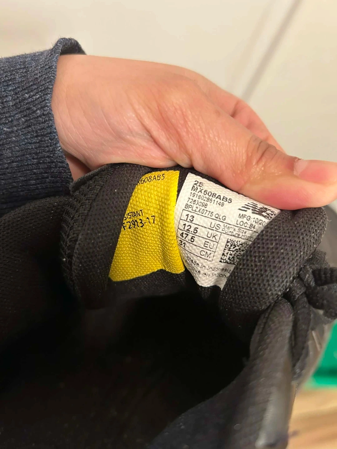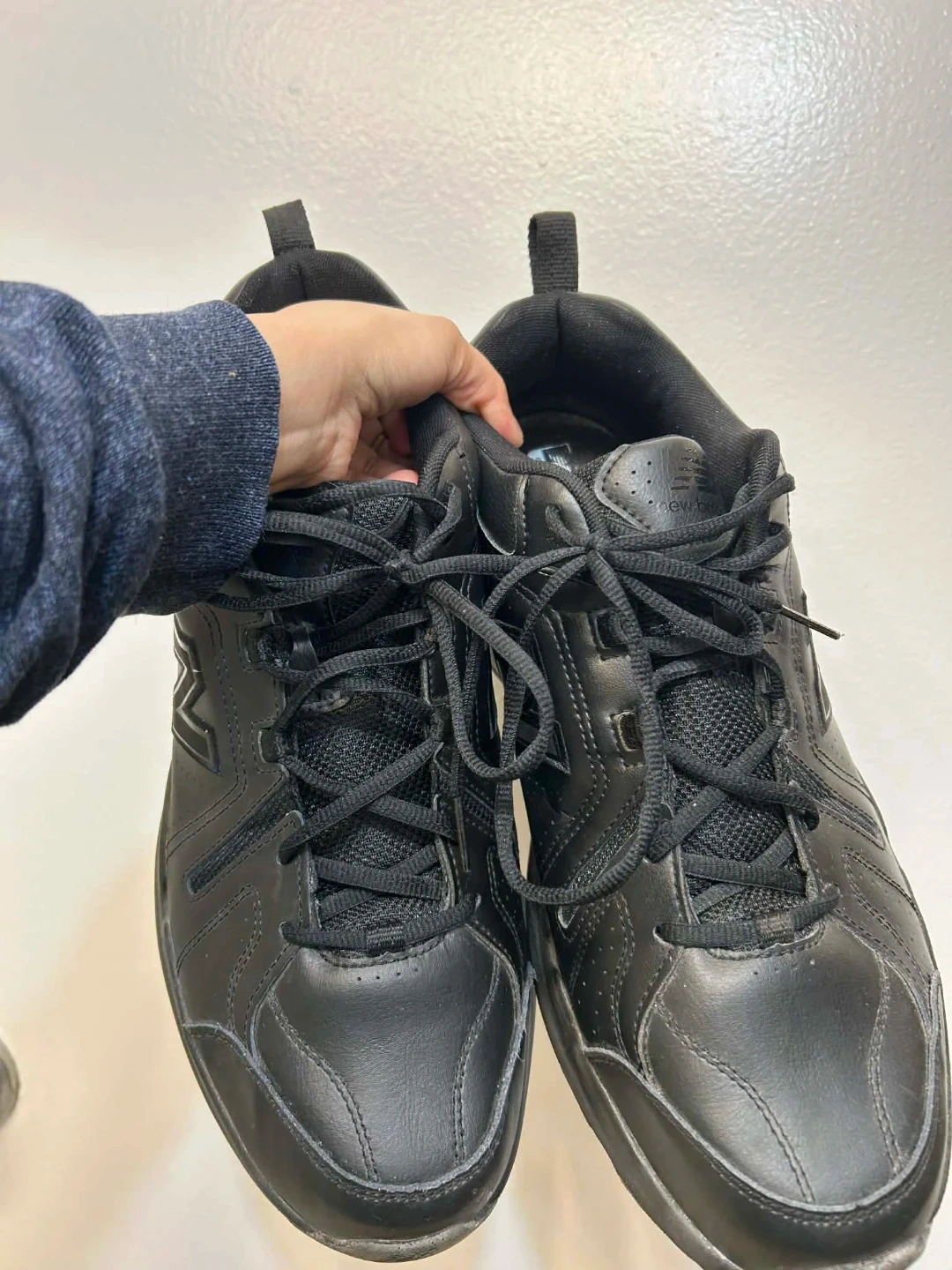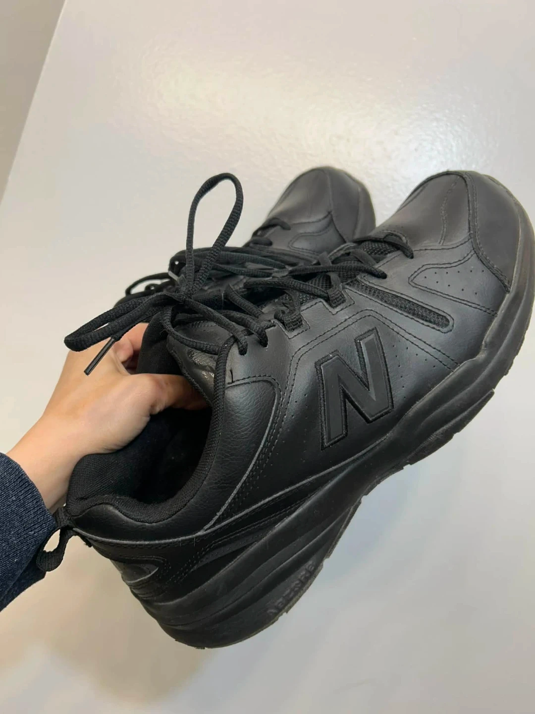 New Balance MX608AB5 walking shoes in black. Men's size 13 US, 12.5 UK, 47.5 EU. These shoes are made with leather and synthetic materials. They feature a soft and supportive insole. Great for walking and everyday wear!