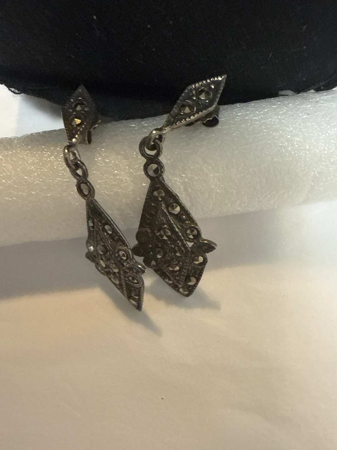 A pair of vintage dangly earrings featuring intricate marcasite detailing. They have a clip-on backing. These earrings are perfect for adding a touch of classic elegance to any outfit!