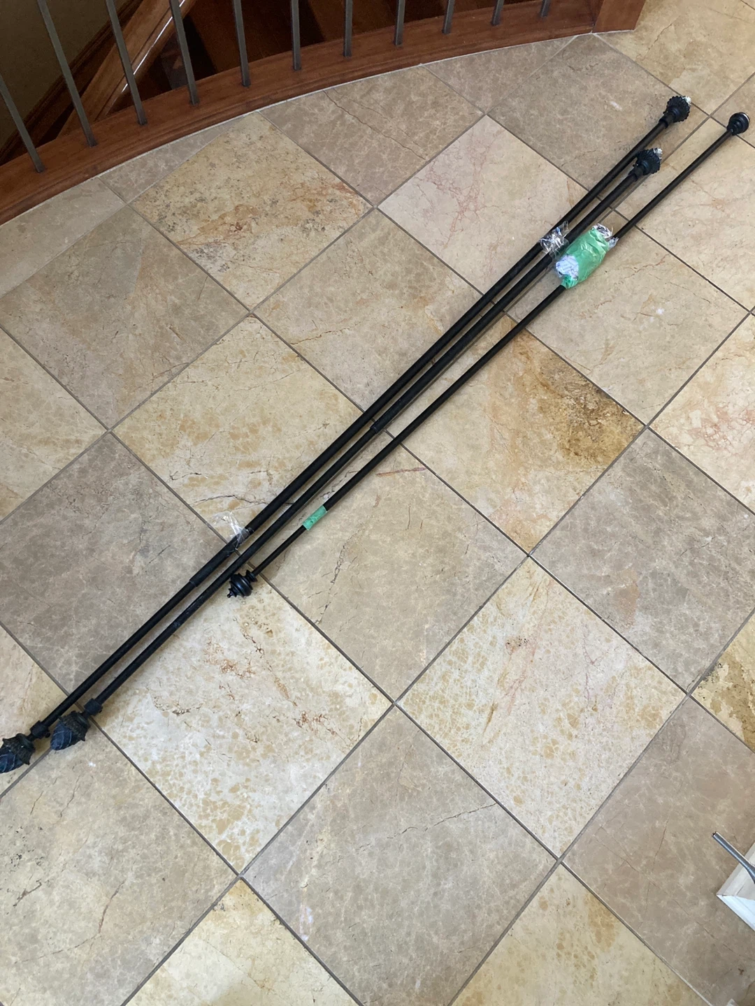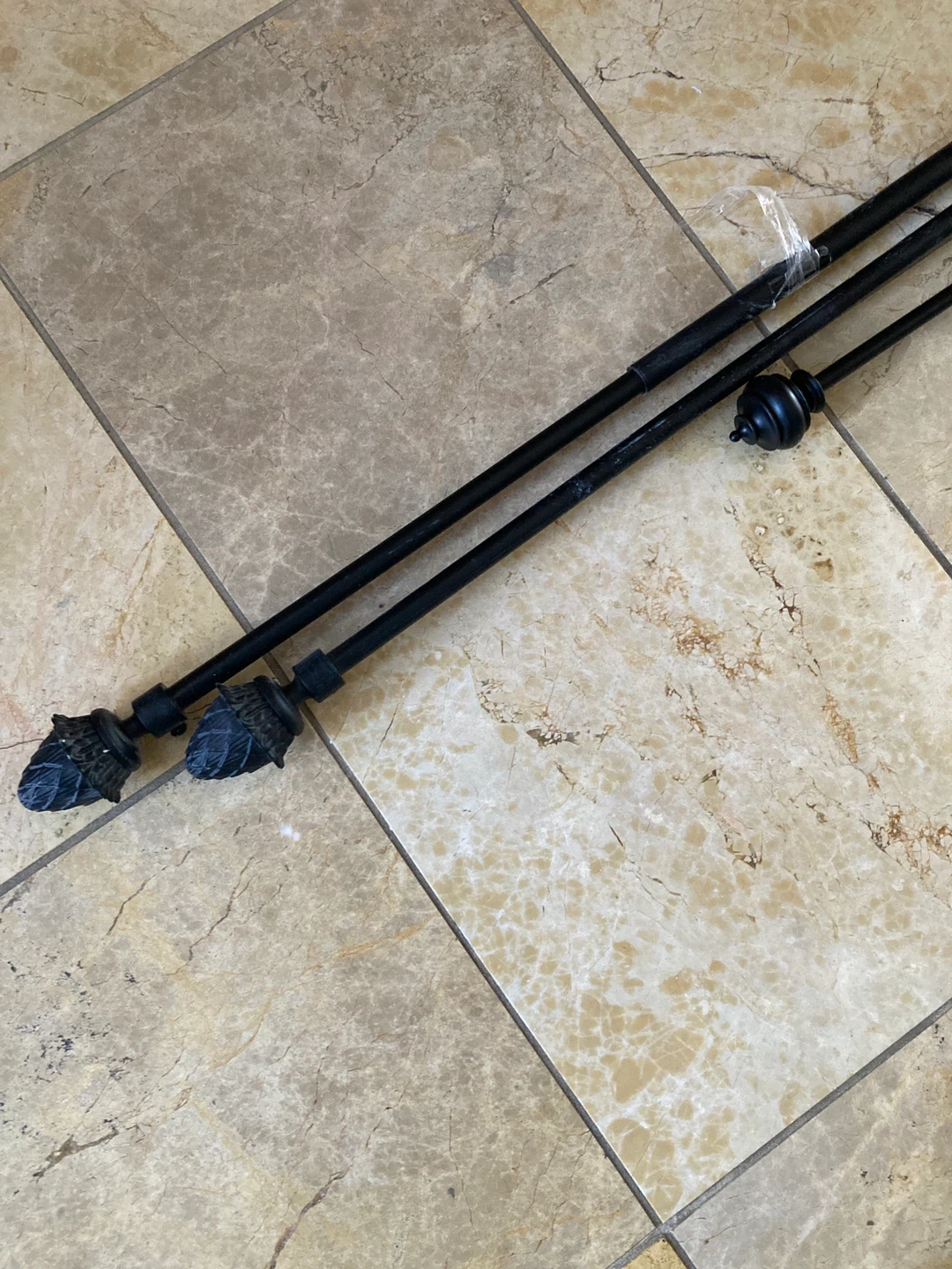 Three black curtain rod sets. They come with decorative finials for a stylish look. These sets are suitable for hanging drapes or sheer curtains in any room. Will sell individually $3-5 EA or as a batch all for $10