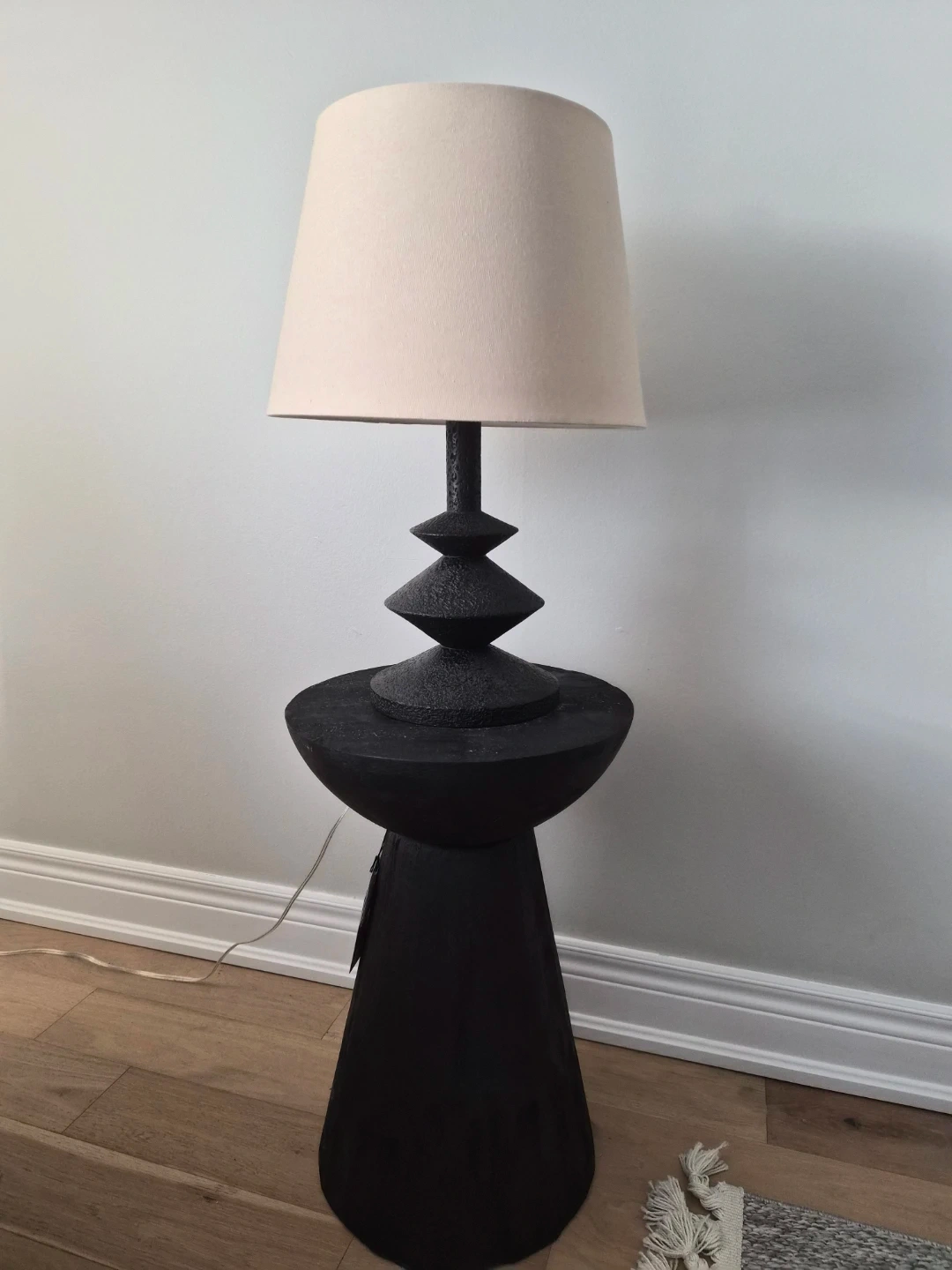 Hand crafted table whit unique floor lamp. It comes topped with a neutral cream-coloured shade. It's a striking accent piece for any room's .