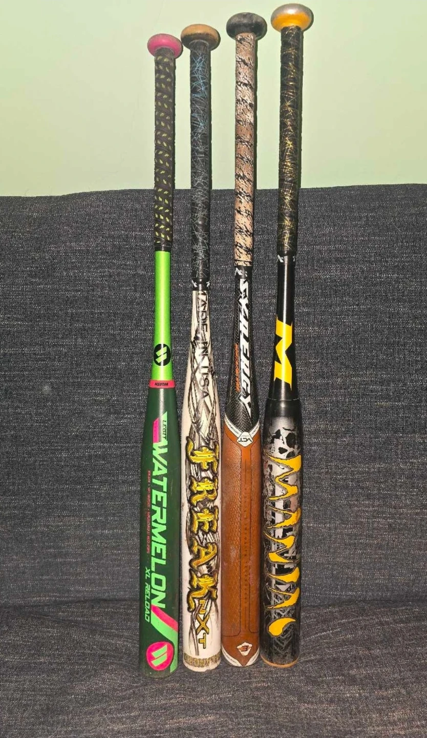 Four baseball bats including a green Worth Watermelon XL Reload. The other bats are a Miken "FREAK" bat, Easton Synergy, and a black Miken Maniac bat. They're all adult-sized.
