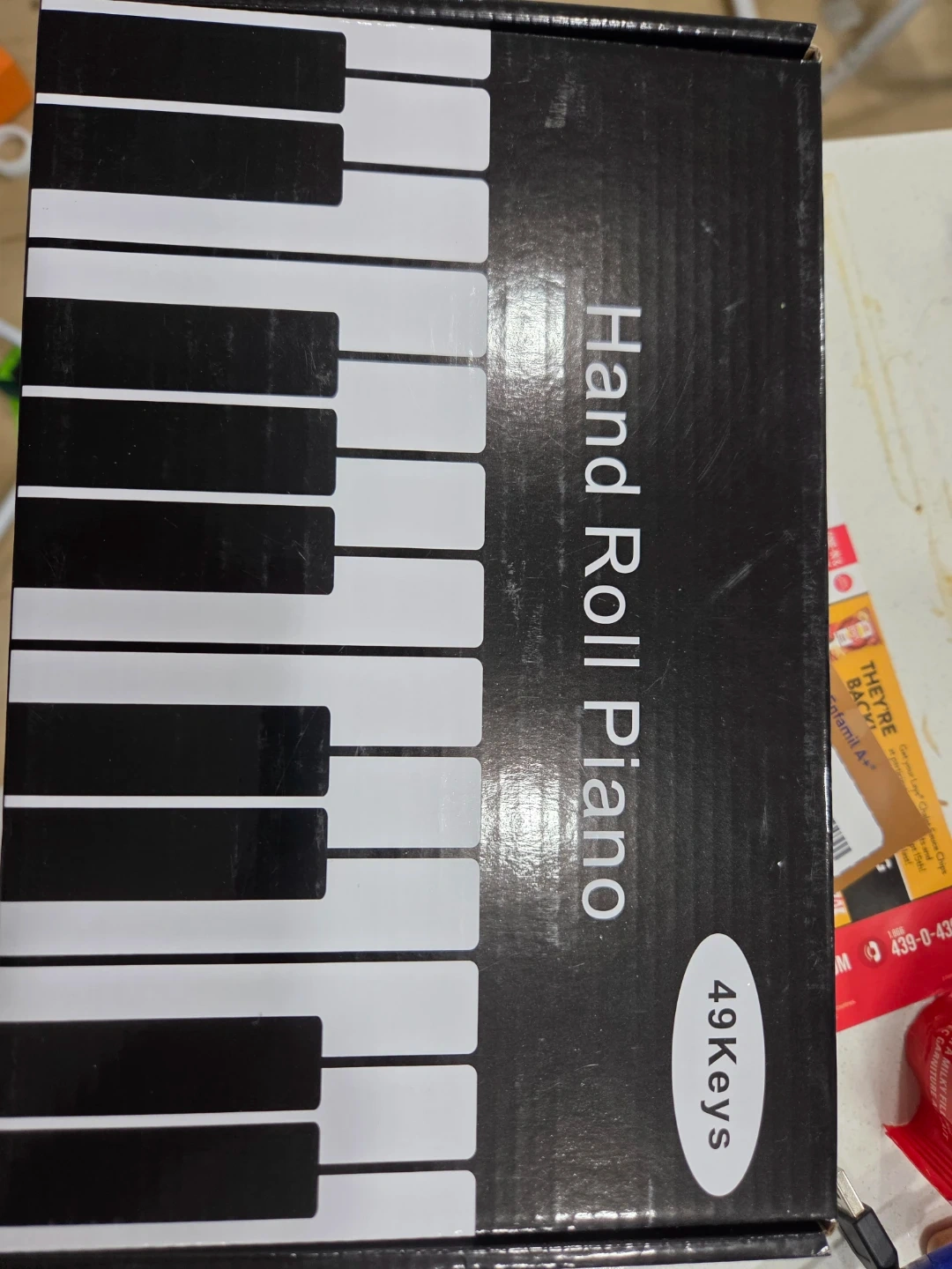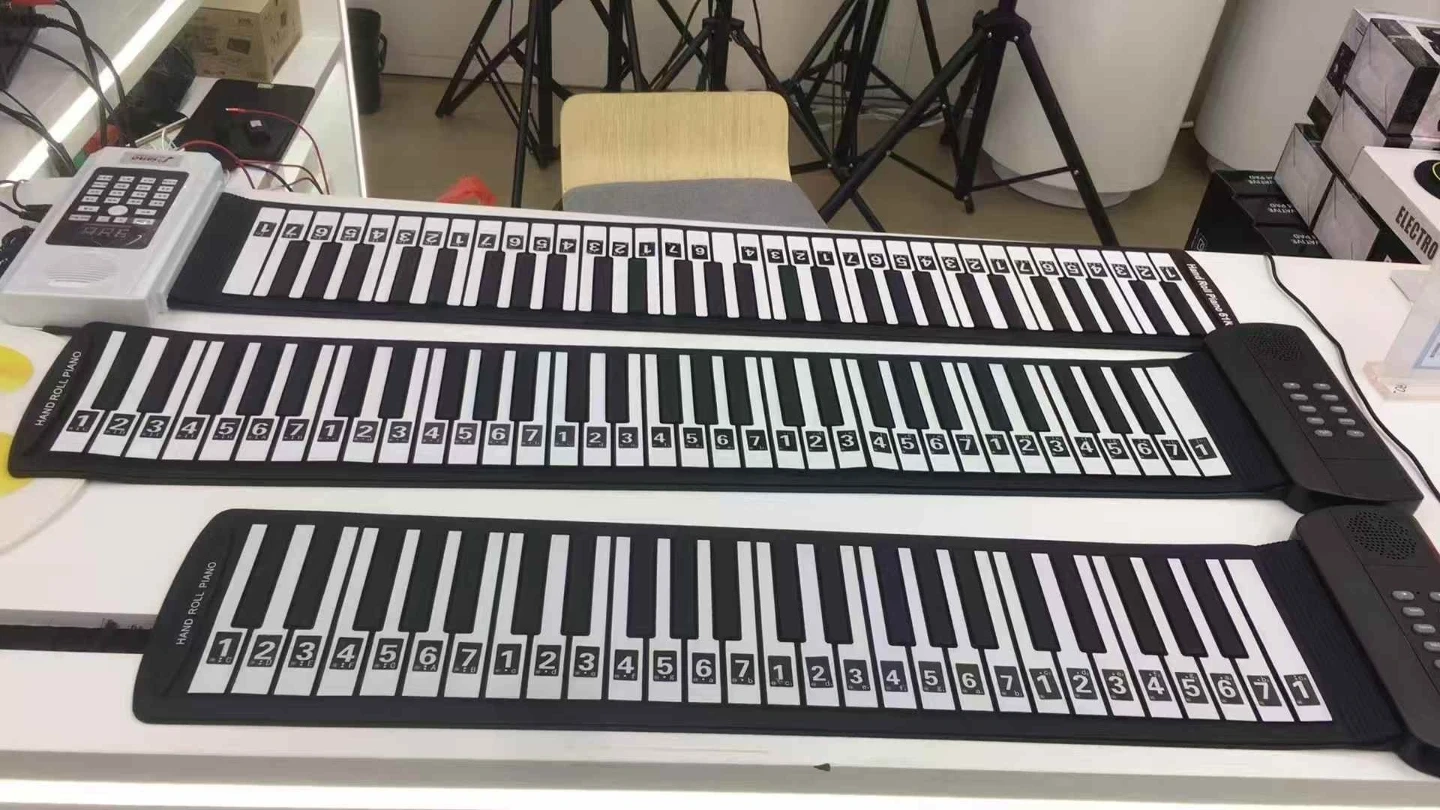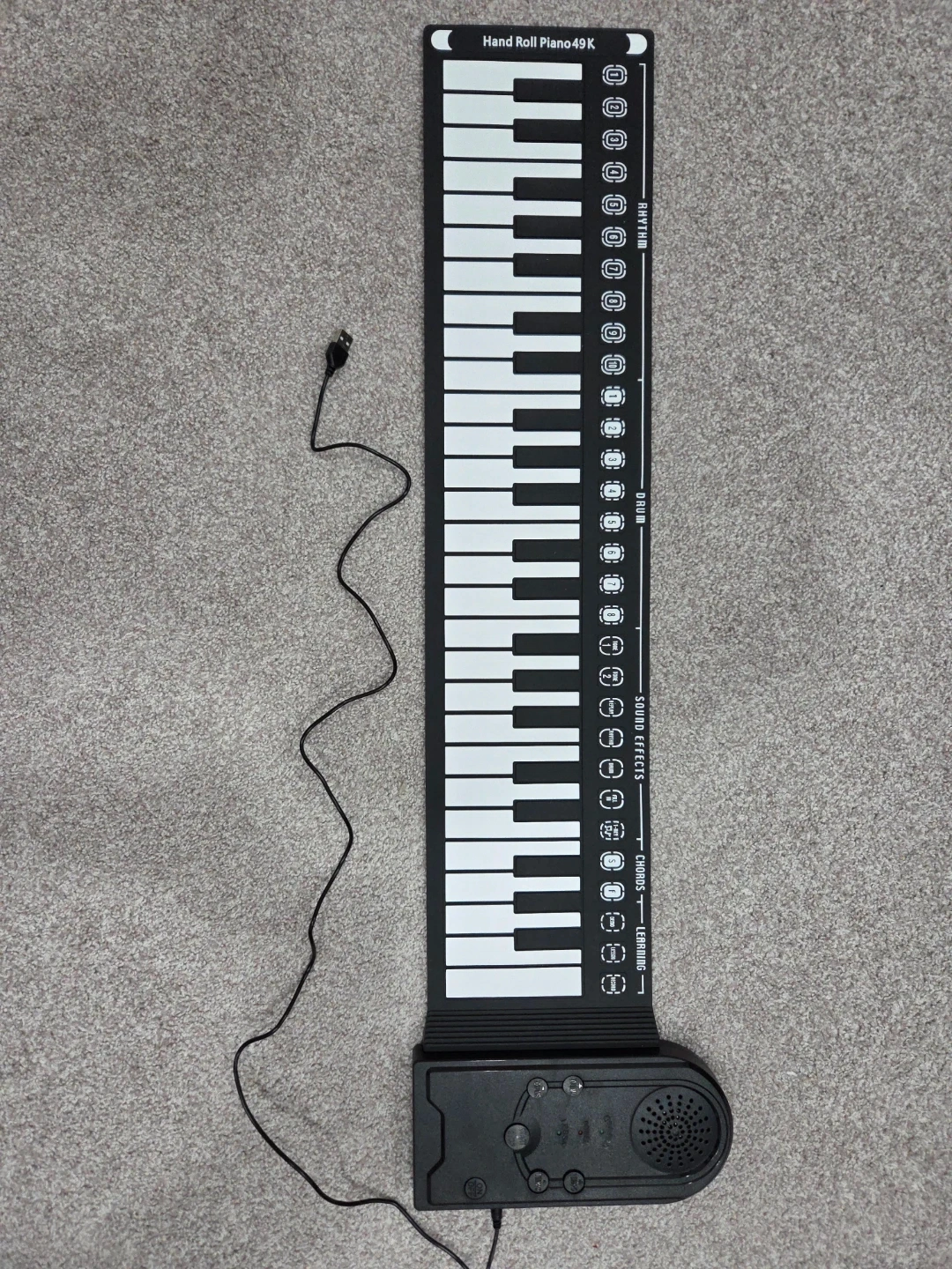 This is a 49-key hand-roll piano. It's portable and can be rolled up for storage. Includes built-in speaker and various sound effects, rhythms, and chord functions.