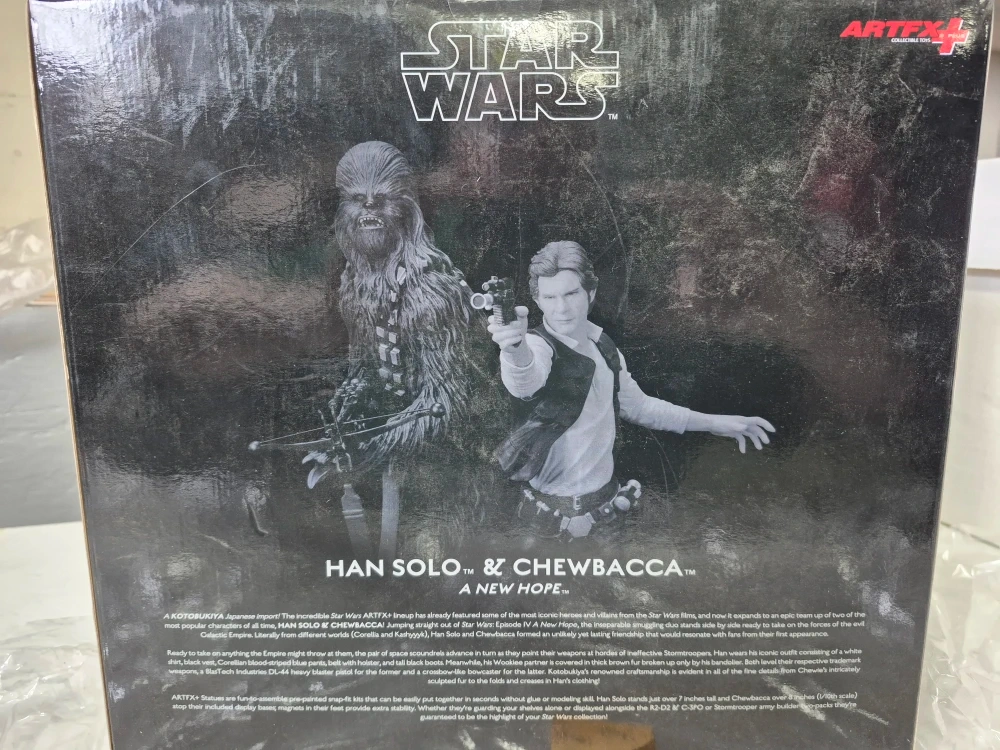 Selling a Star Wars ARTFX+ statue featuring Han Solo and Chewbacca. This Kotobukiya Japanese import is part of the ARTFX+ lineup, known for its detailed and iconic characters. The statue is a 1/10 scale pre-painted snap-fit kit that's easy to assemble without glue or modelling skill. Han Solo stands just over 7 inches tall and Chewbacca is covered in thick brown fur. Magnets in their feet provide extra stability on the included display bases. Guaranteed to be the highlight of your Star Wars collection!