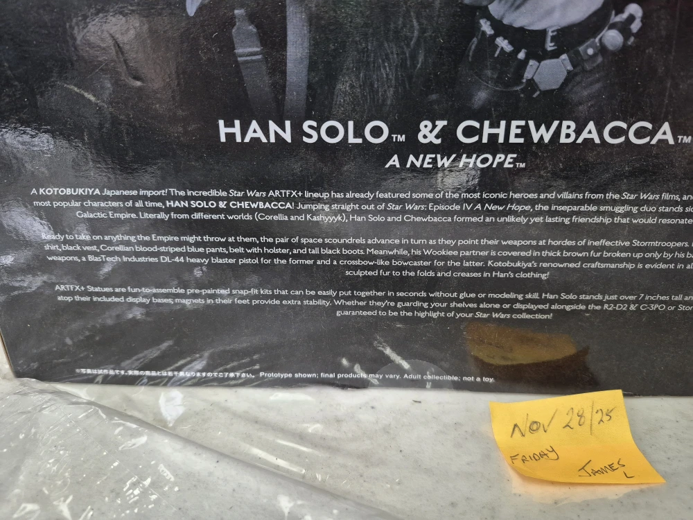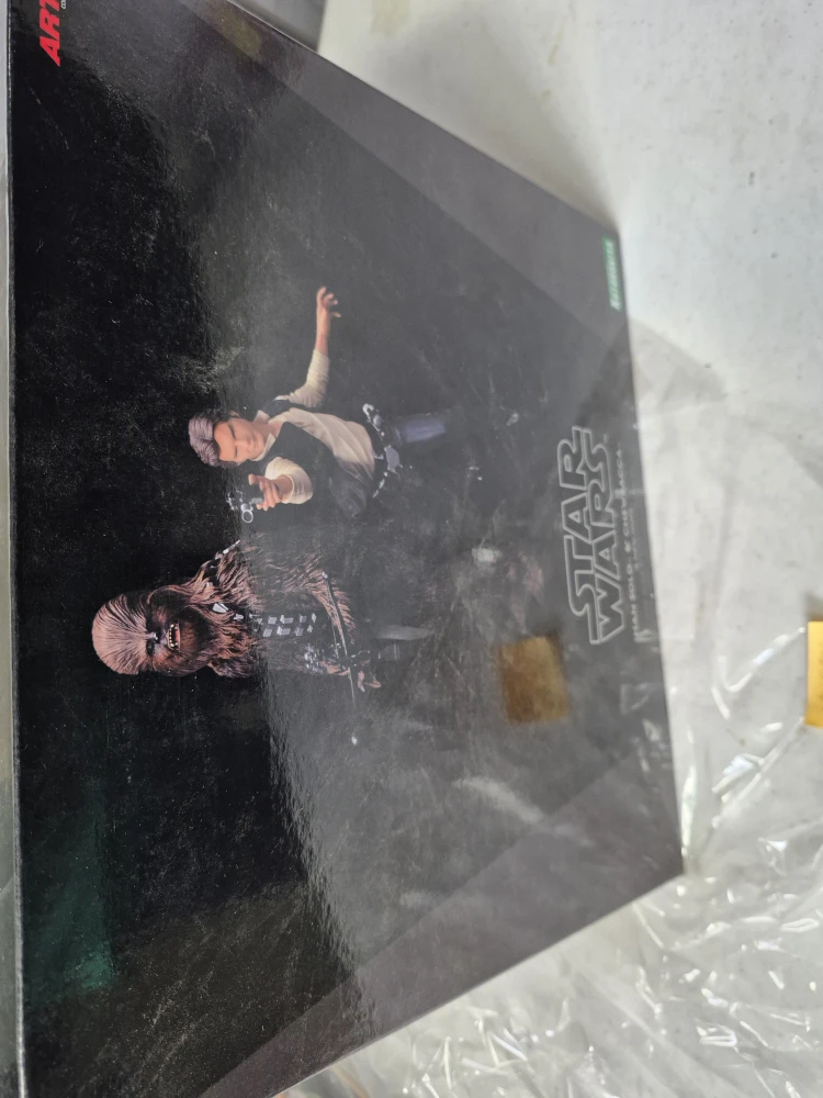 Selling a Star Wars ARTFX+ statue featuring Han Solo and Chewbacca. This Kotobukiya Japanese import is part of the ARTFX+ lineup, known for its detailed and iconic characters. The statue is a 1/10 scale pre-painted snap-fit kit that's easy to assemble without glue or modelling skill. Han Solo stands just over 7 inches tall and Chewbacca is covered in thick brown fur. Magnets in their feet provide extra stability on the included display bases. Guaranteed to be the highlight of your Star Wars collection!