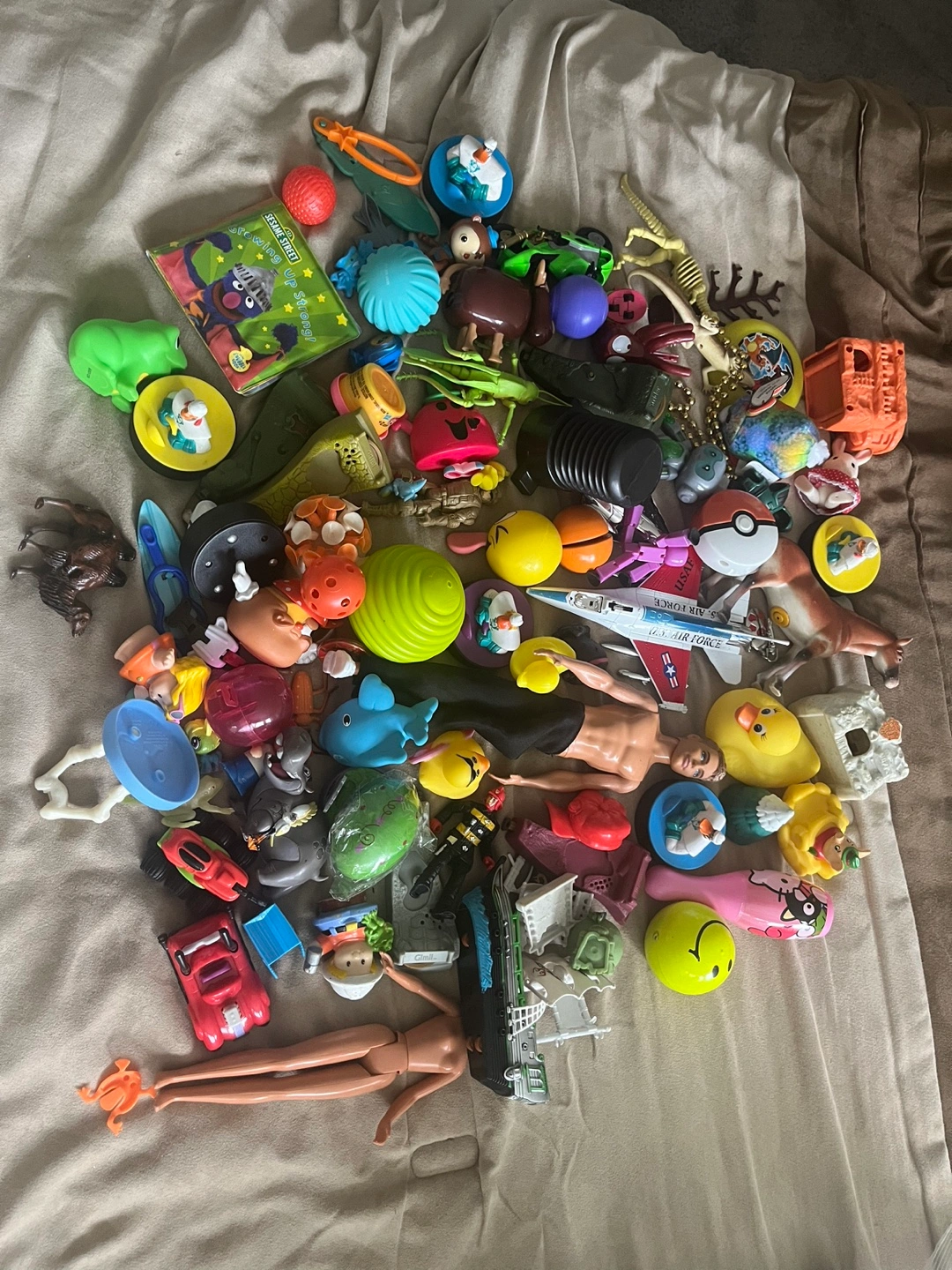 A large lots of assorted toys. Some items are new and have brand names and others do not. Most of the toys are in good condition.