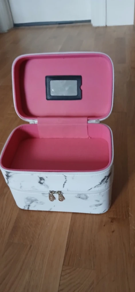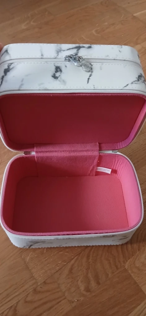 This cosmetic or jewellery organizer features a marble pattern exterior and a pink interior. It includes a small mirror inside the lid. It's perfect for organizing jewellery, makeup or toiletries for travel or home use.