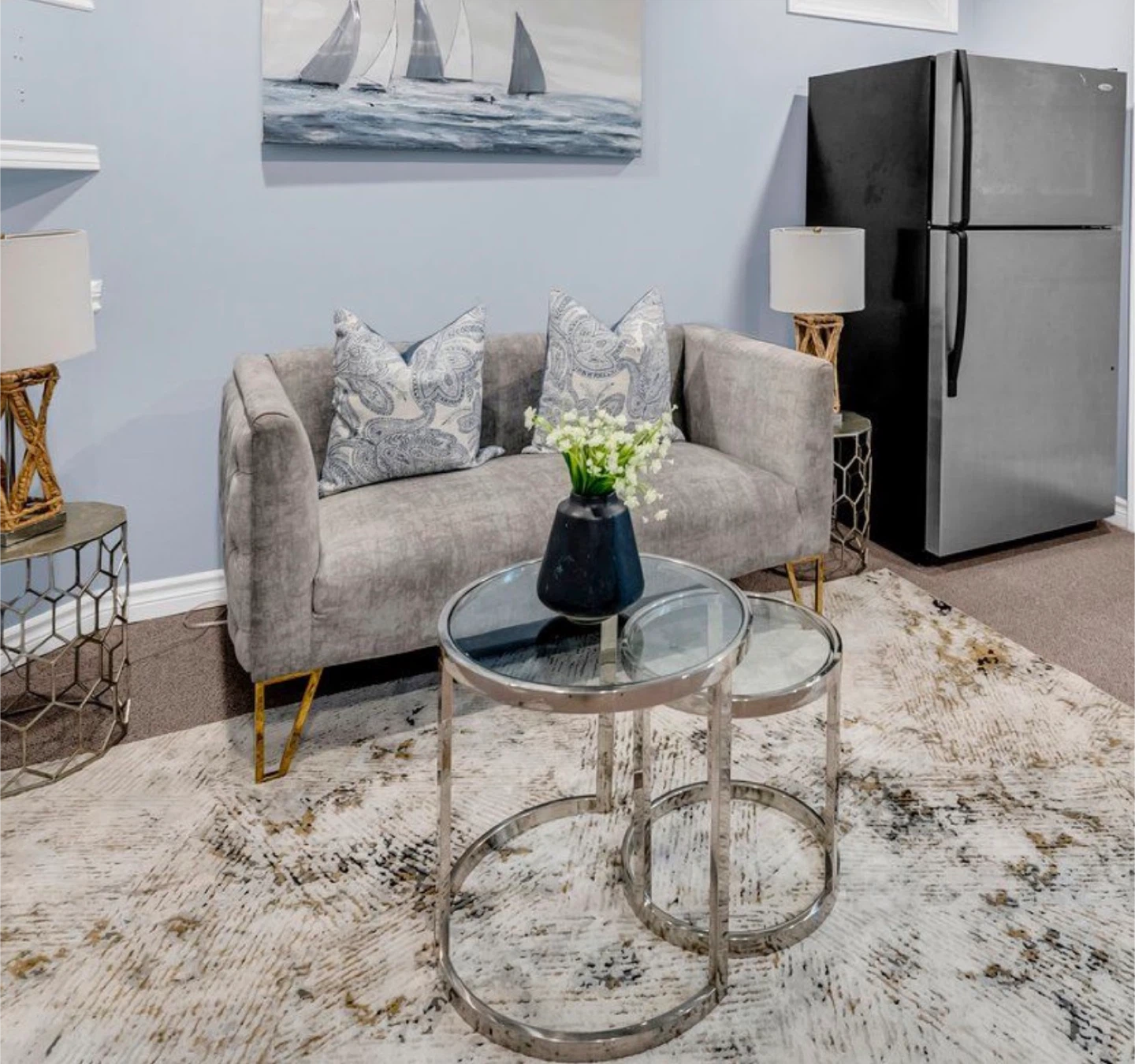 Selling a lovely grey velvet loveseat! It's in great condition and would be a stylish addition to any living space. Perfect for small apartments or cozy nooks. The velvet material is soft and comfortable, and the neutral grey colour will match any decor. It also has gold legs, which adds a touch of elegance!