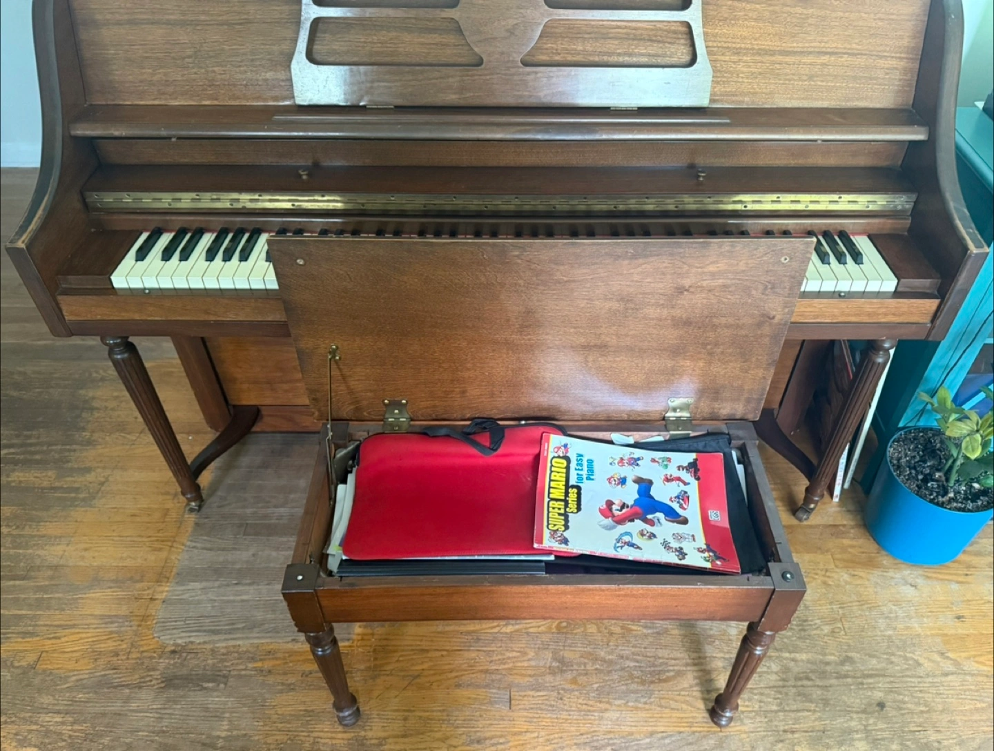 Selling a used upright piano, perfect for beginners or experienced players! It comes with a matching bench that has a storage compartment for sheet music or other accessories. The piano is in good condition and has a lovely, warm tone. A great addition to any home!