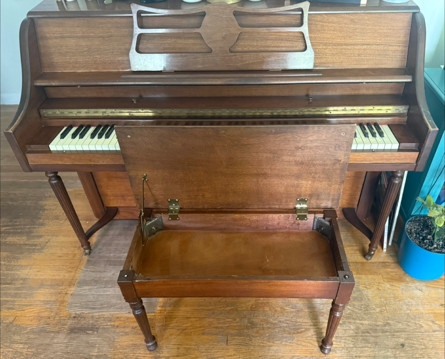 Selling a used upright piano, perfect for beginners or experienced players! It comes with a matching bench that has a storage compartment for sheet music or other accessories. The piano is in good condition and has a lovely, warm tone. A great addition to any home!