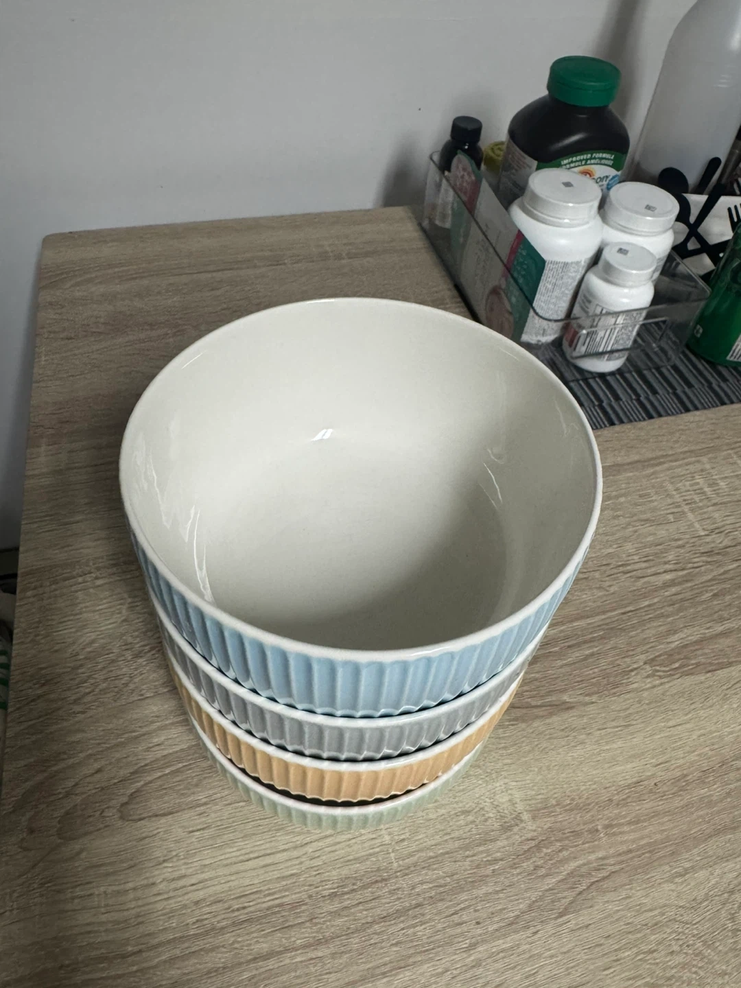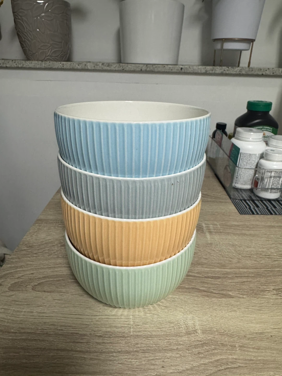 This is a set of four ceramic serving bowls. They feature a ribbed exterior design and come in pastel blue, grey, orange, and green colours. Made from durable ceramic material.
