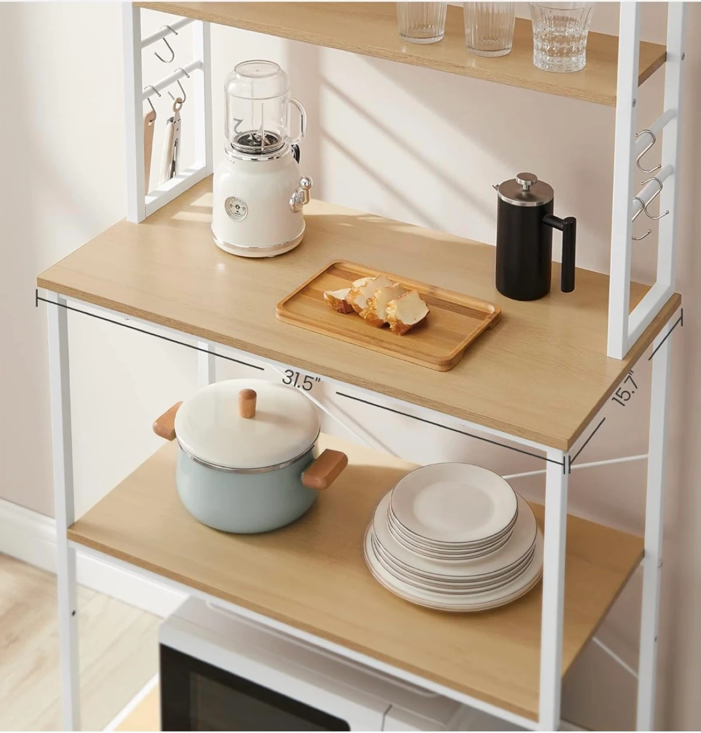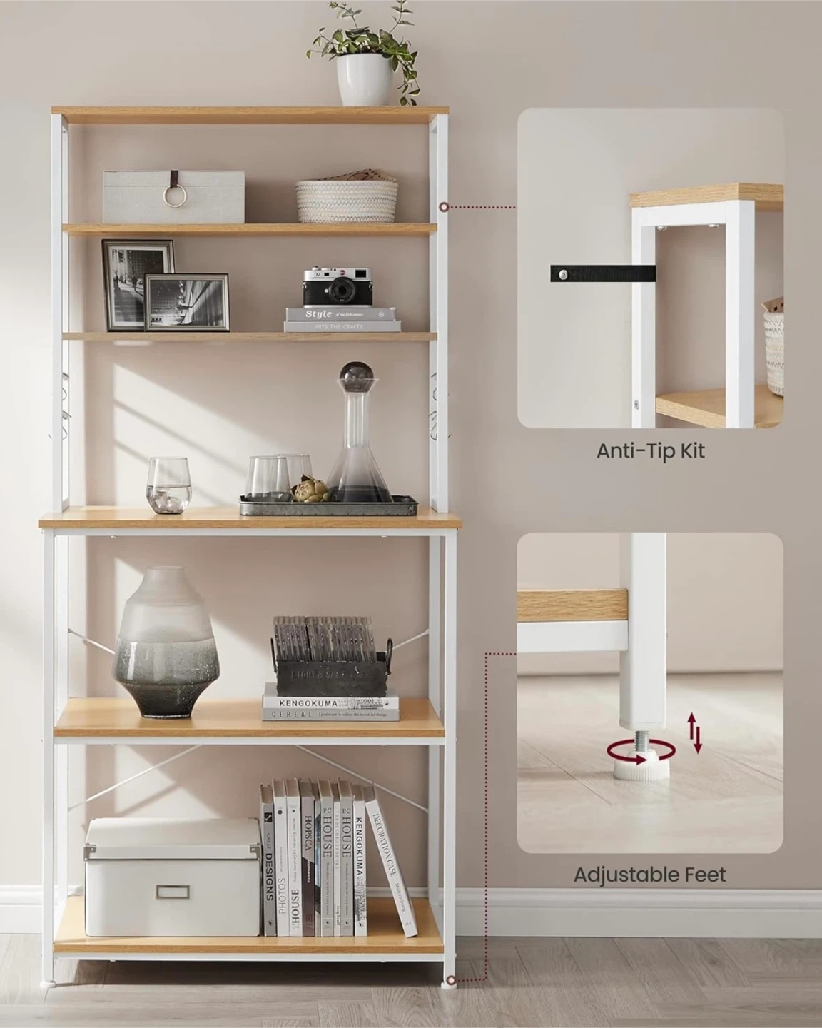 This VASAGLE kitchen baker's rack offers ample storage with 5 tiers. It's constructed with a sturdy metal frame and wood-look shelves. The dimensions are 31.5" W x 15.7" D x 65.7" H. Includes an anti-tip kit for stability.