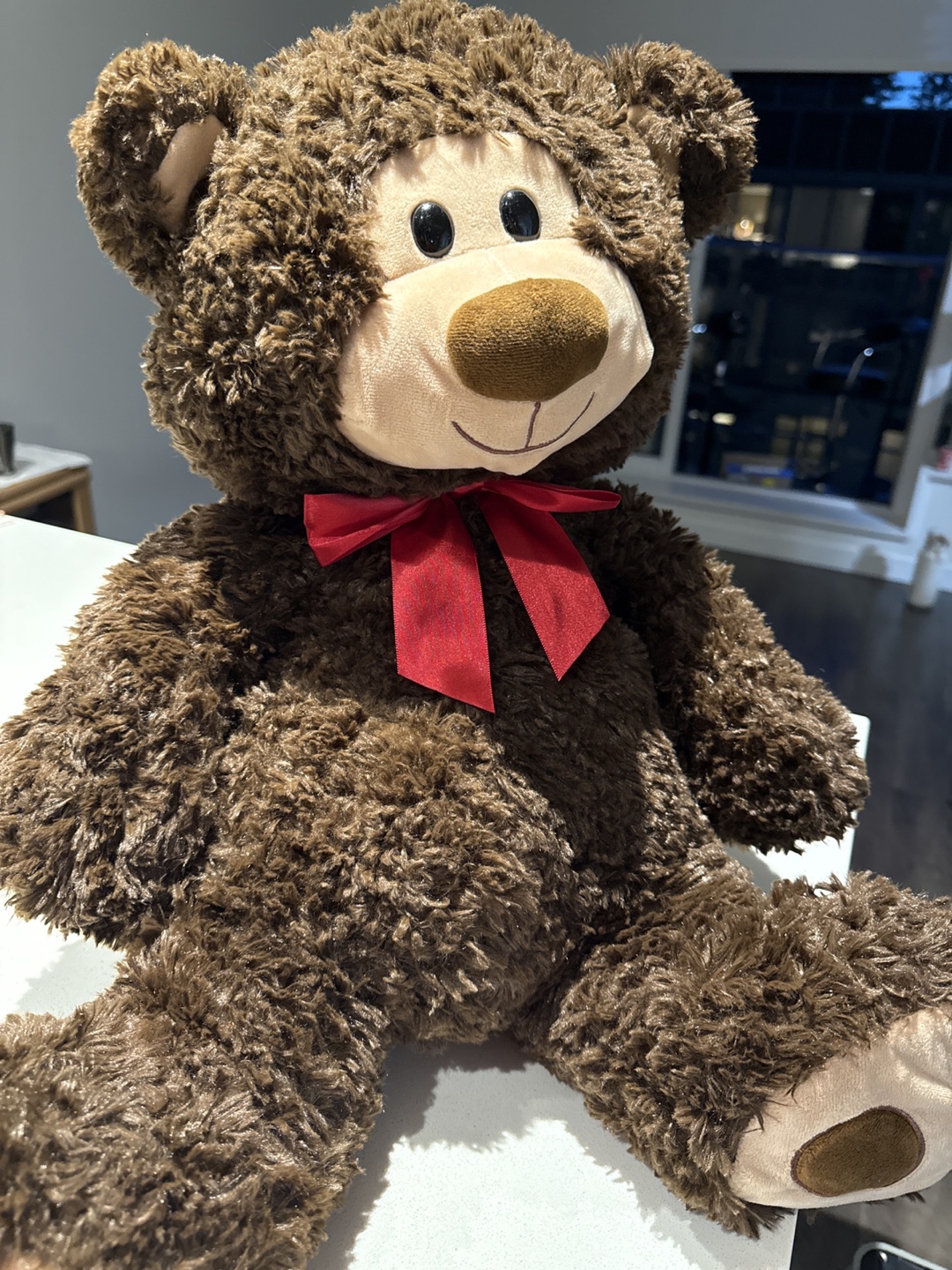A cute and cuddly brown teddy bear looking for a new home! This plush toy features a soft, furry texture and a charming red ribbon around its neck. It's in great condition and ready to bring joy to someone special