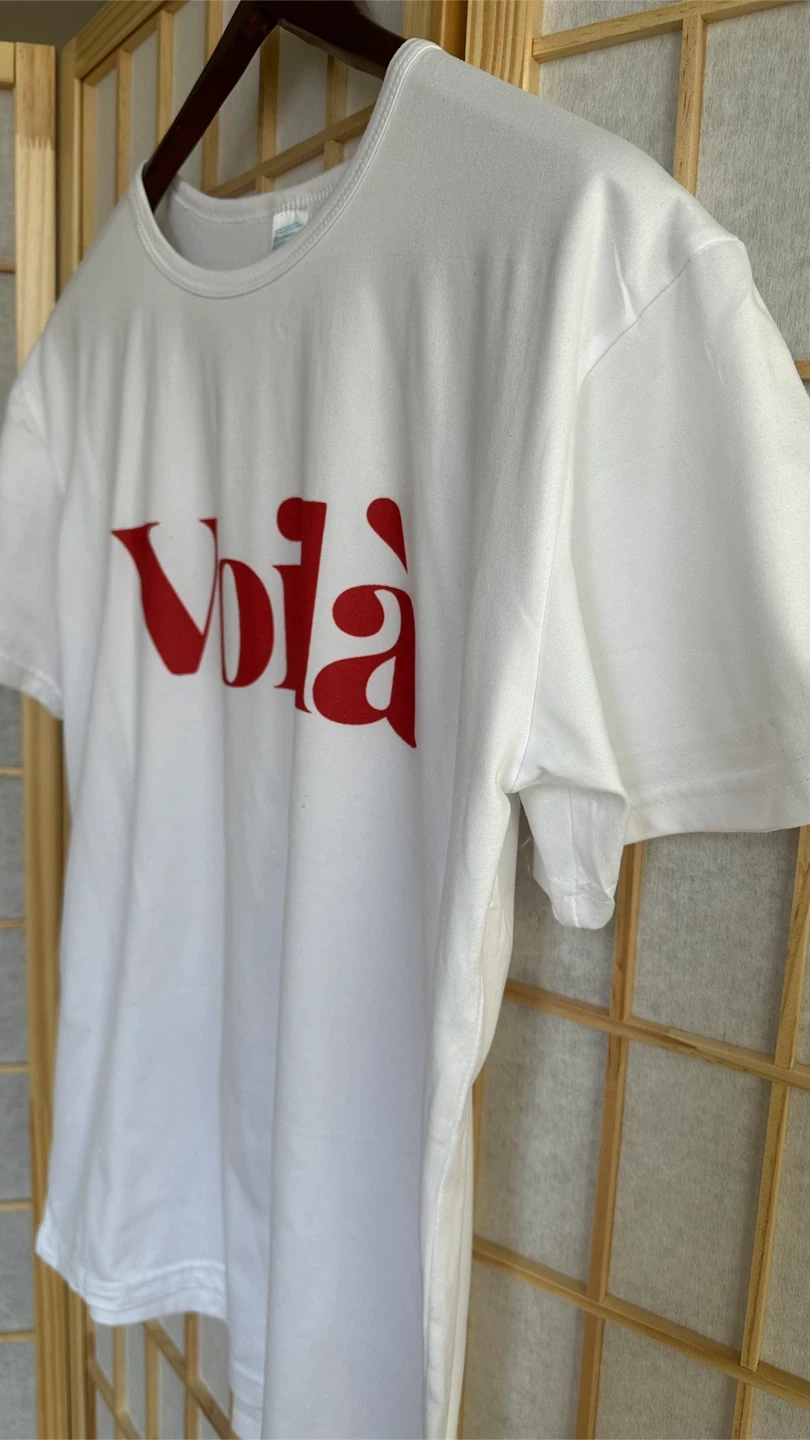 This is a white t-shirt with a red "Voilà" graphic. Brand new, never worn.