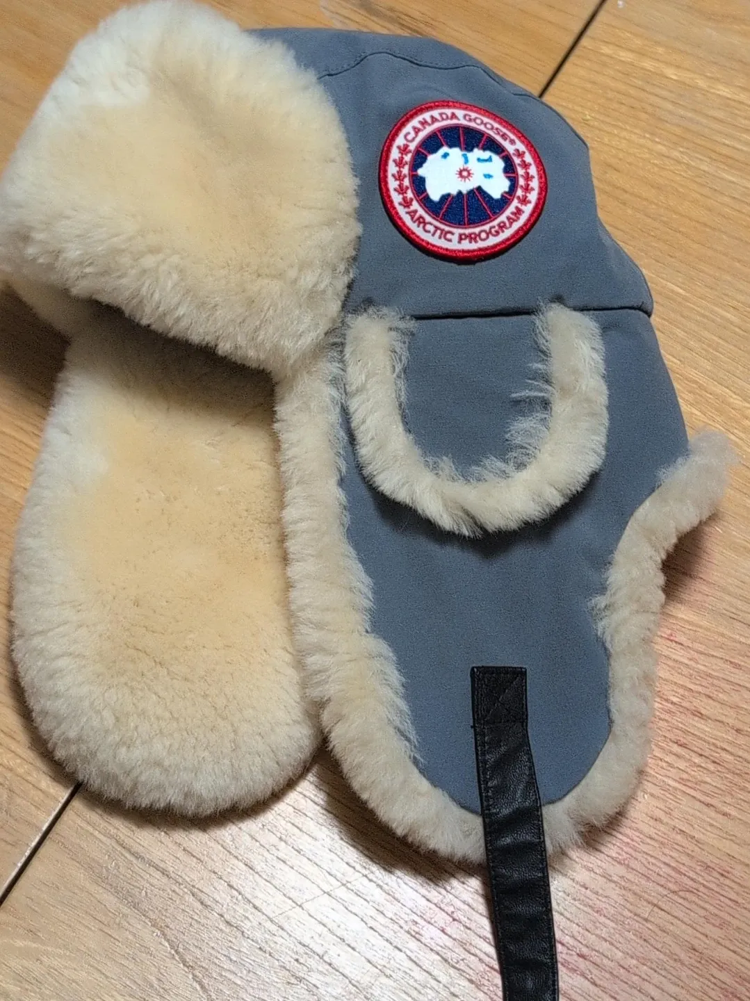 This Canada Goose aviator hat is designed for warmth and protection. It features a blue exterior with fluffy cream-coloured trim and ear flaps. It's suitable for very cold weather.