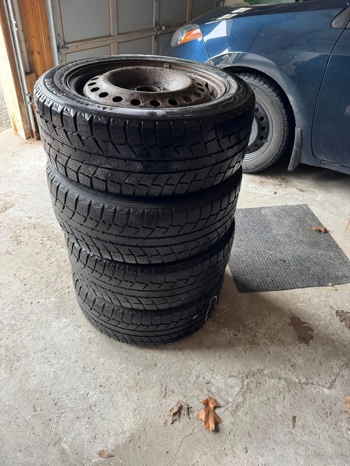 Selling a set of 205/55R16 winter tires mounted on steel rims.