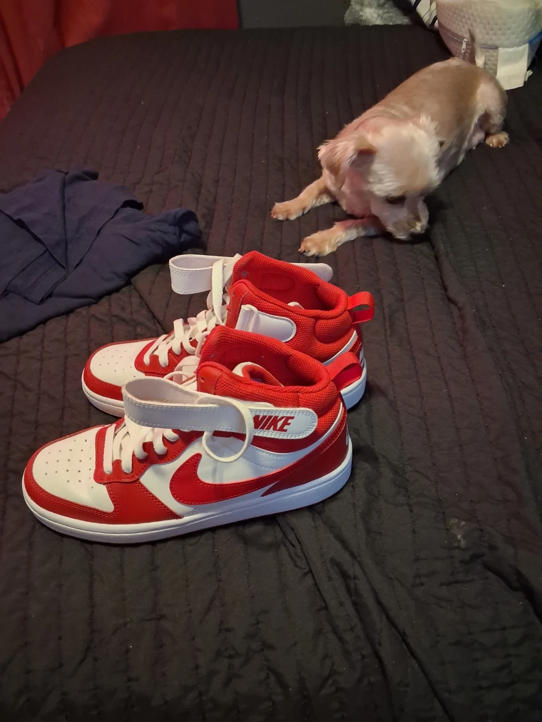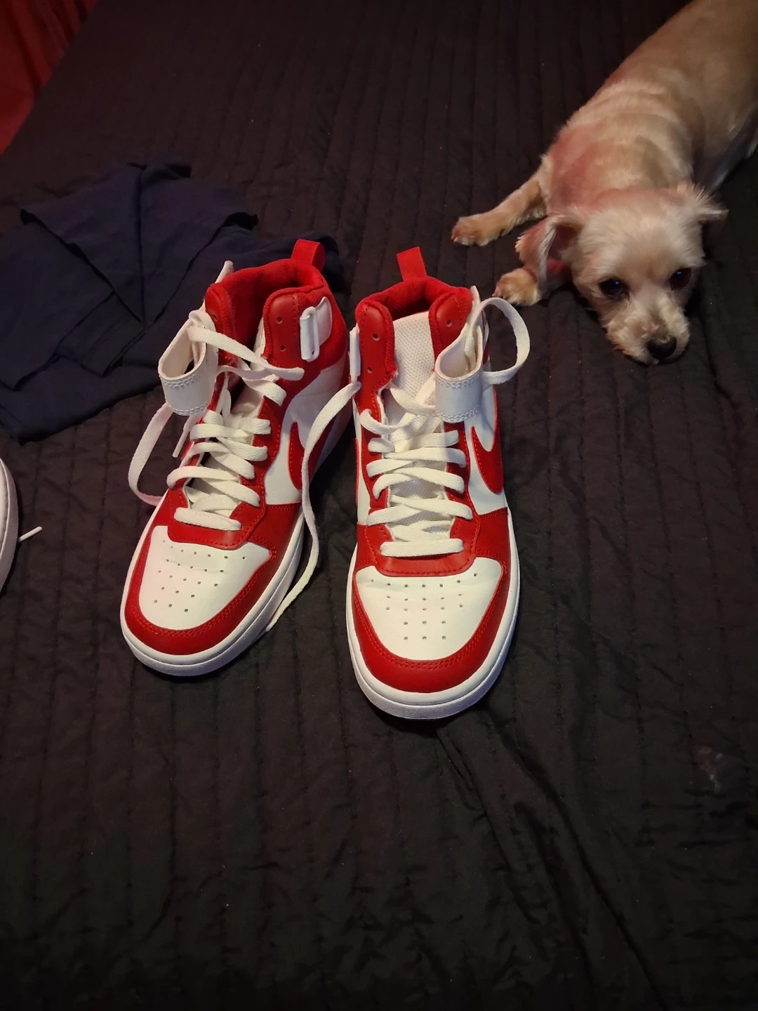 Nike Court Vision Mid kids' shoes in red and white. High-top design with velcro strap closure. Perfect for active youngsters! Size 6.5 youth is wore 2x.