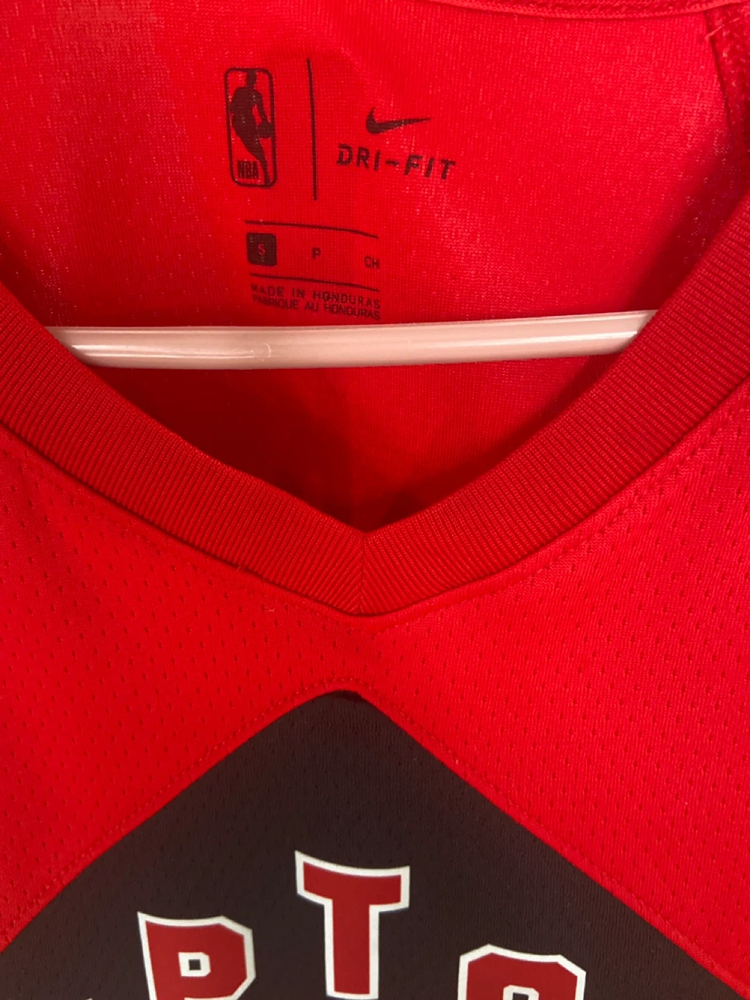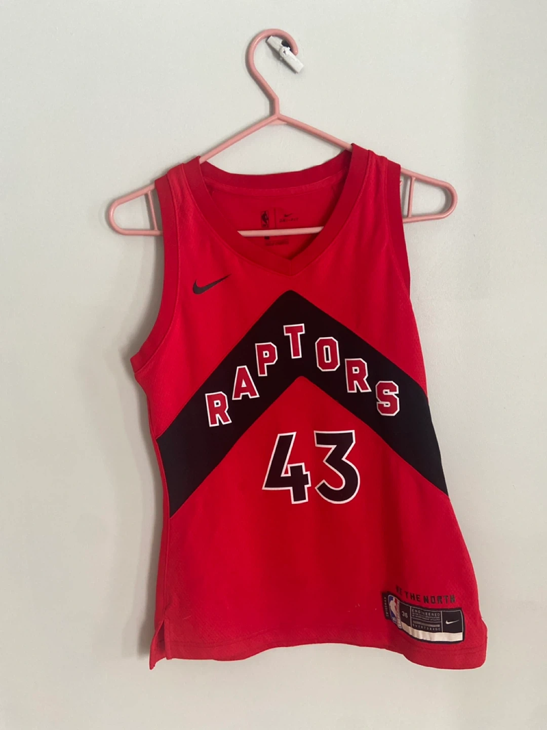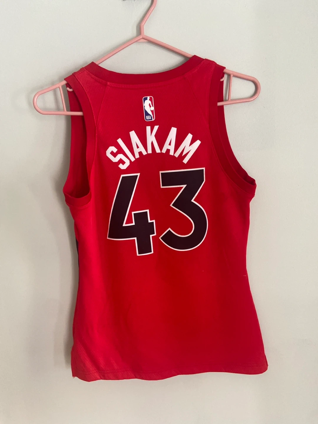 This red Nike NBA jersey features the Toronto Raptors logo and Pascal Siakam's name and number 43. It's made with Dri-FIT material. Size is S.