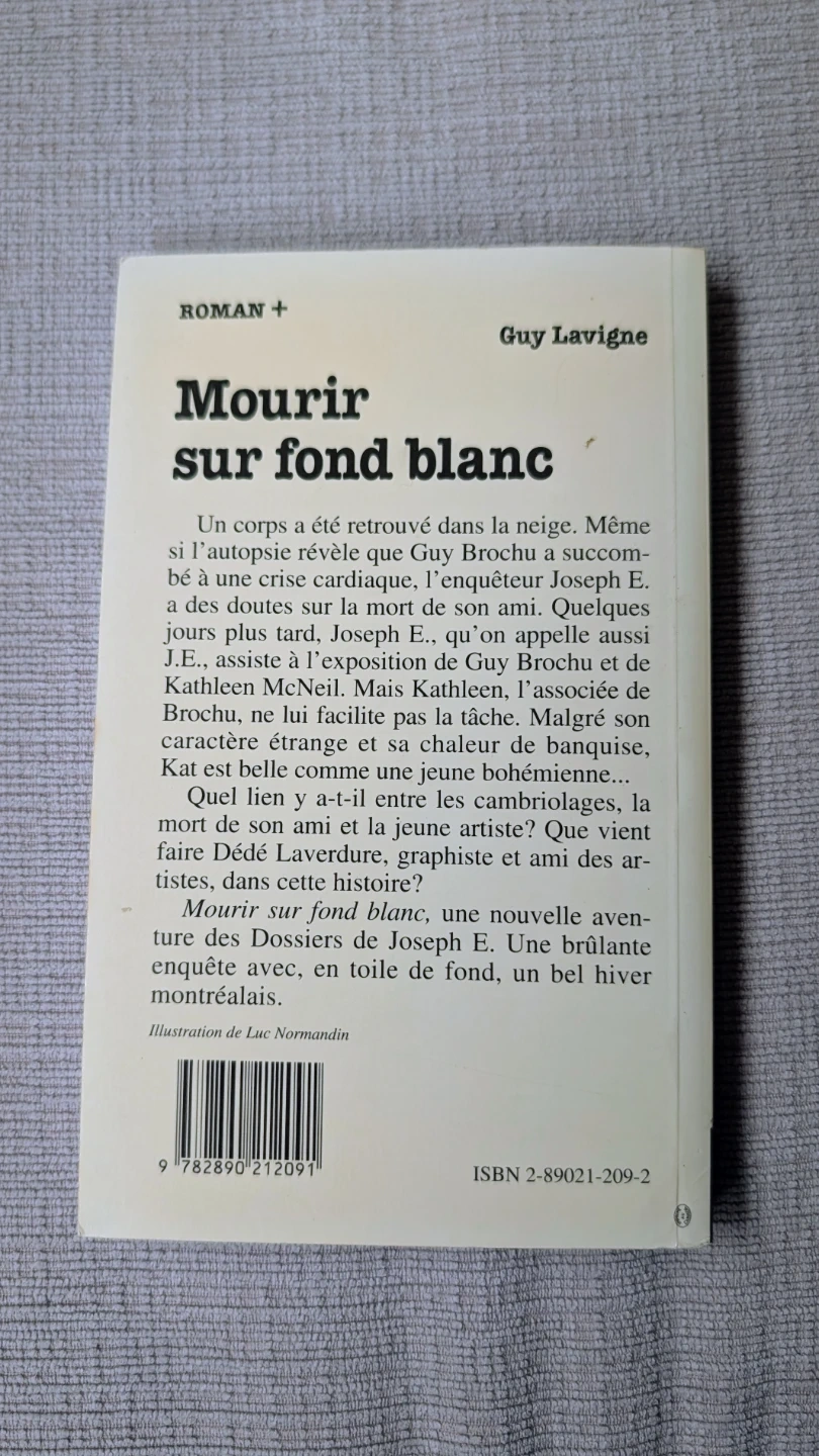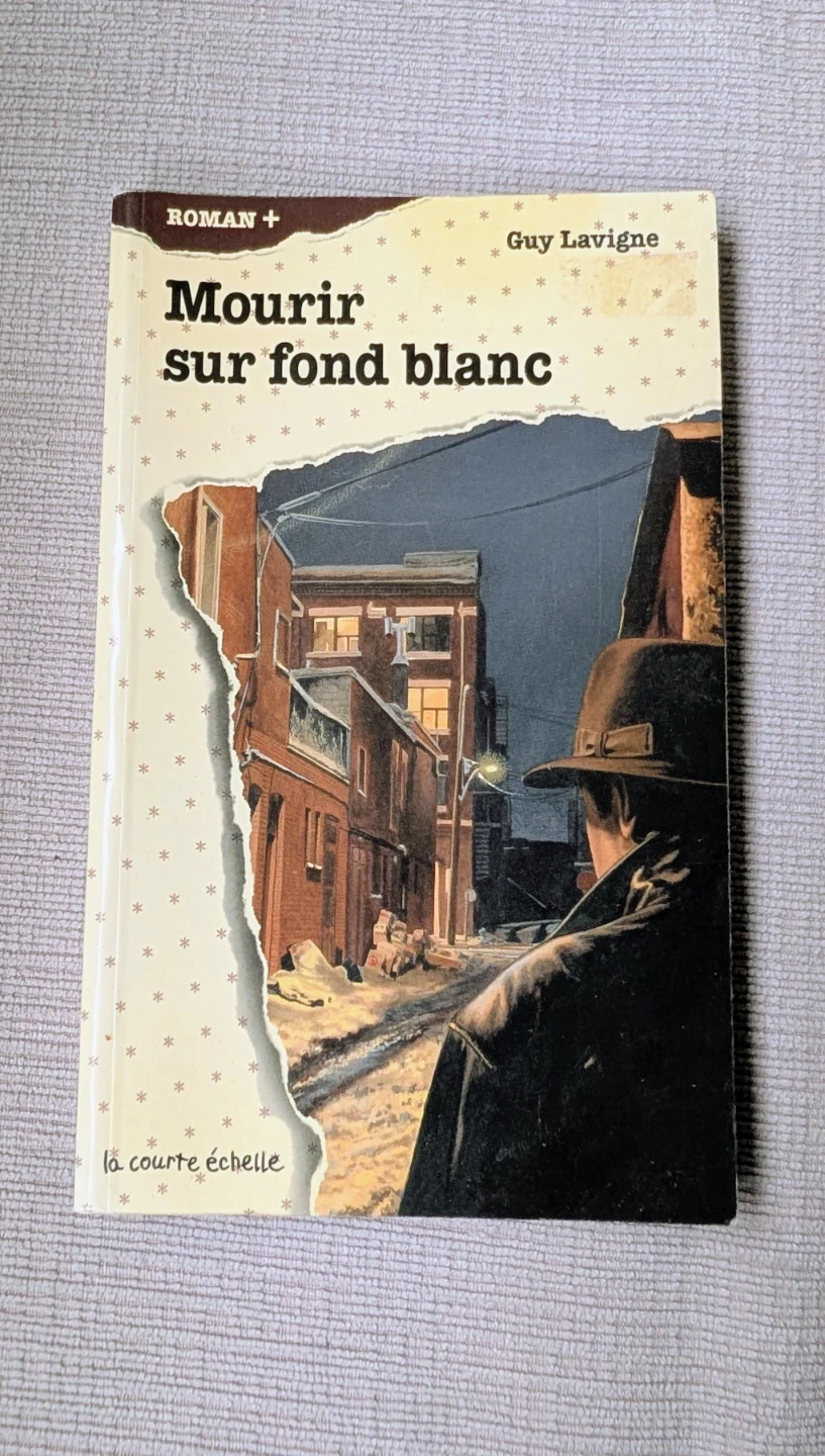 This is the novel 'Mourir sur fond blanc' by Guy Lavigne. It's part of the Roman+ collection. This mystery novel explores the investigation into a death discovered in the snow.