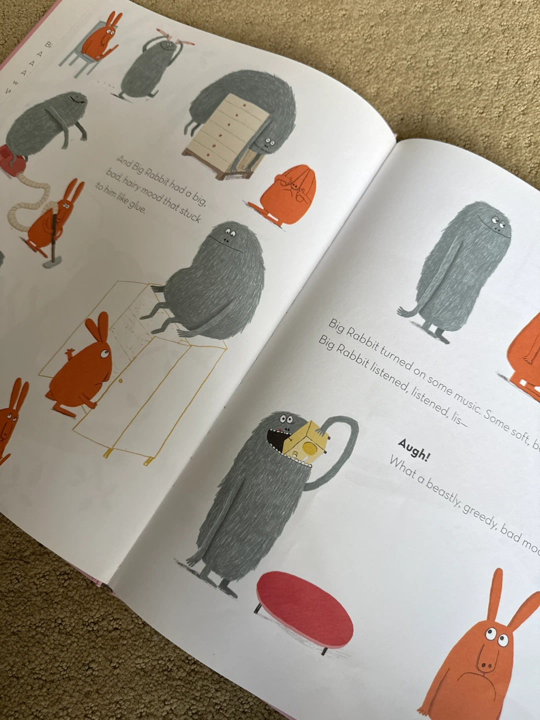 Selling the book 'Big Rabbit's Bad Mood' by Ramona Badescu, illustrated by Delphine Durand! It's a super cute book about feelings and moods, perfect for kids. The illustrations are really fun and unique, and the story is very engaging!