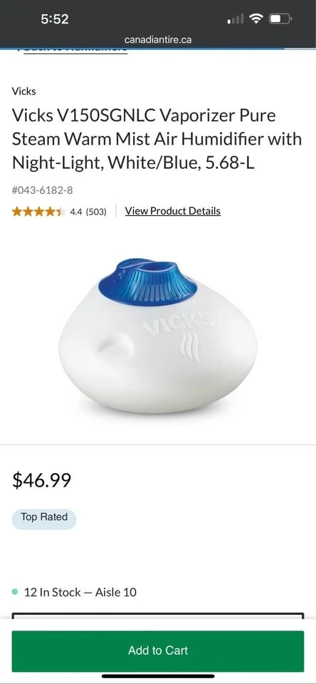 This Vicks V150SGNLC Vaporizer Pure Steam Warm Mist Air Humidifier with Night-Light, White/Blue, 5.68-L retails for $46.99 plus tax. It's almost new, only used a few times. We have the original box in good condition. Works perfectly.