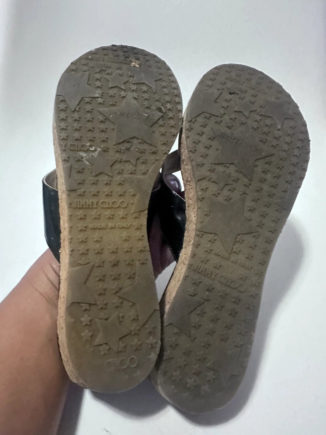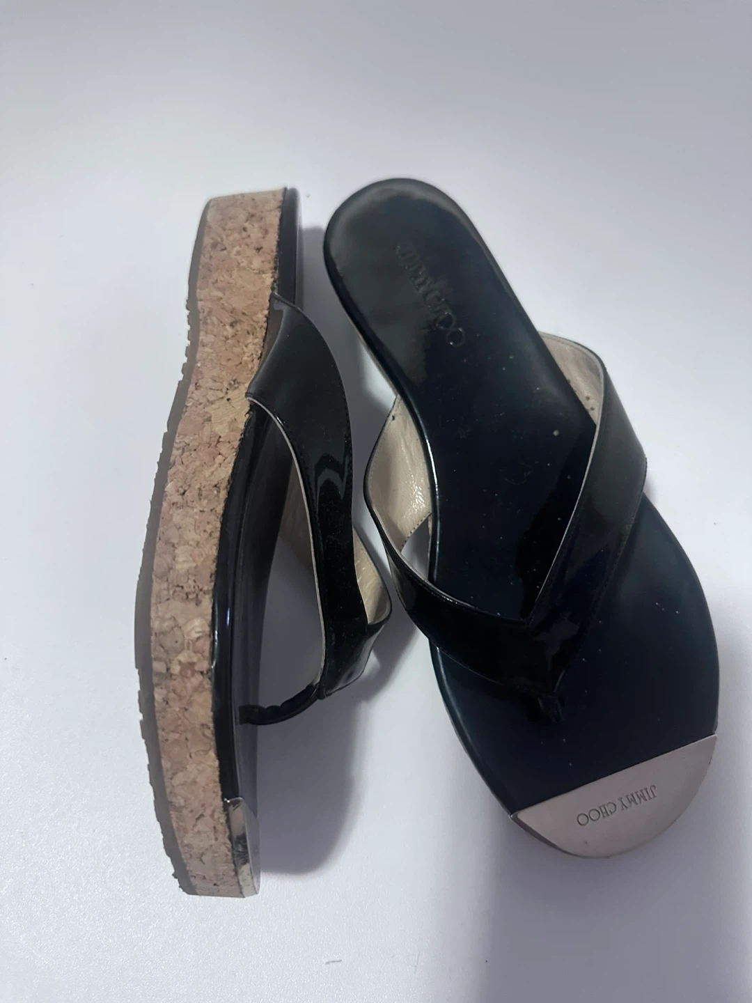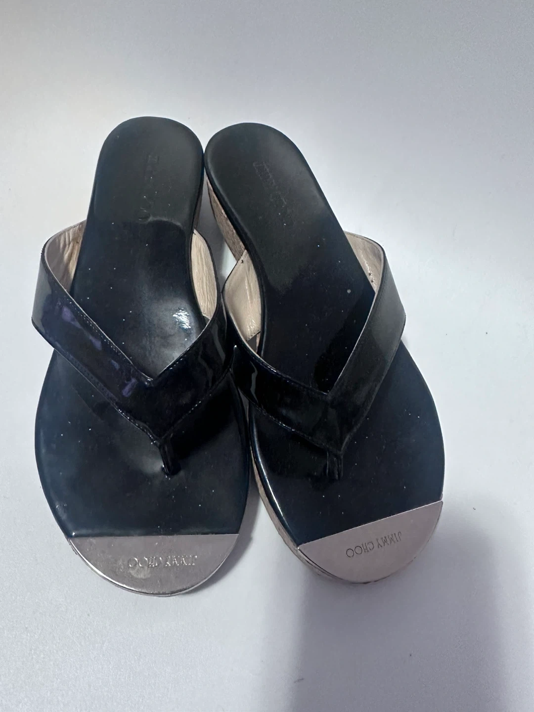 Selling a pair of Jimmy Choo black thong wedge sandals. They are in good condition and feature a stylish wedge heel. Perfect for adding a touch of elegance to your summer outfits!