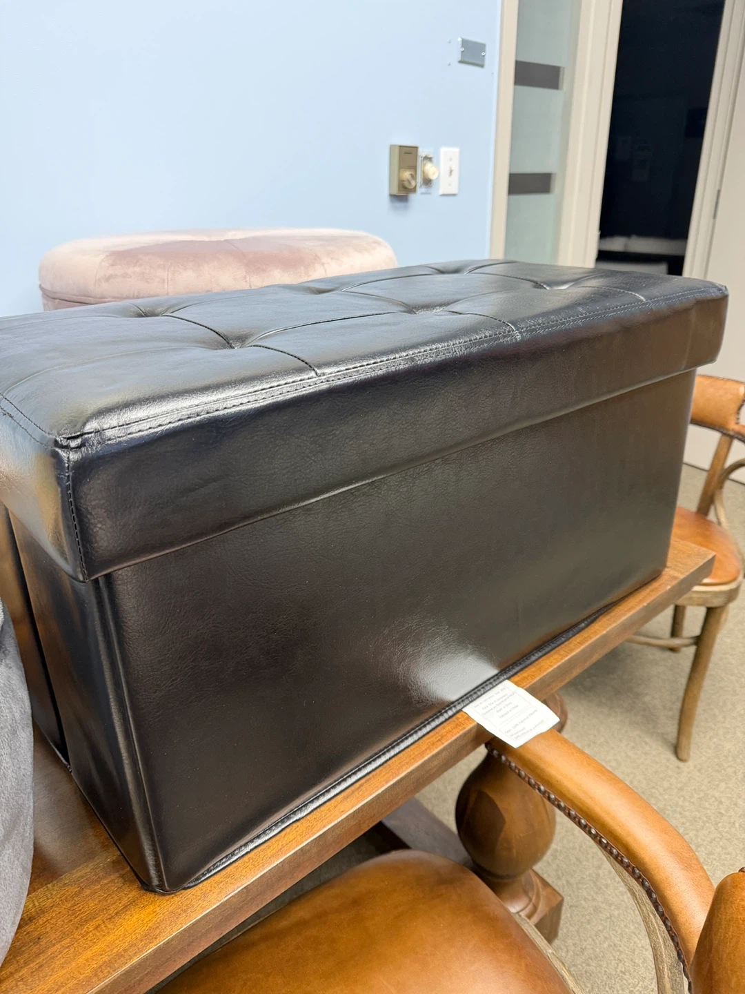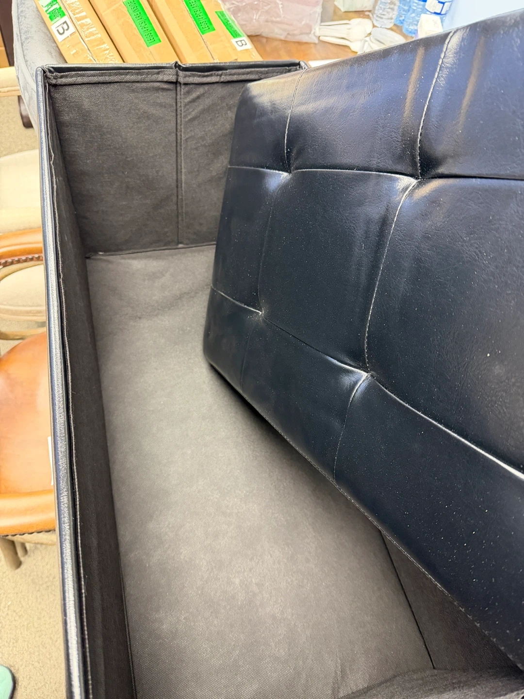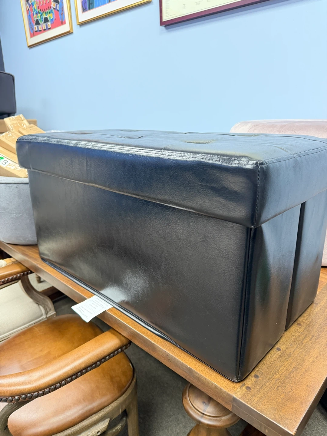 Black faux leather storage ottoman with tufted lid. Folds flat for easy storage when not in use.