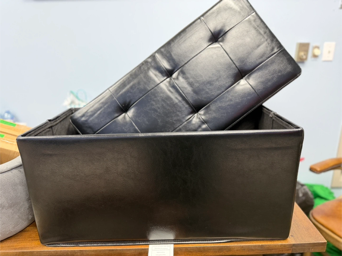 Black faux leather storage ottoman with tufted lid. Folds flat for easy storage when not in use.