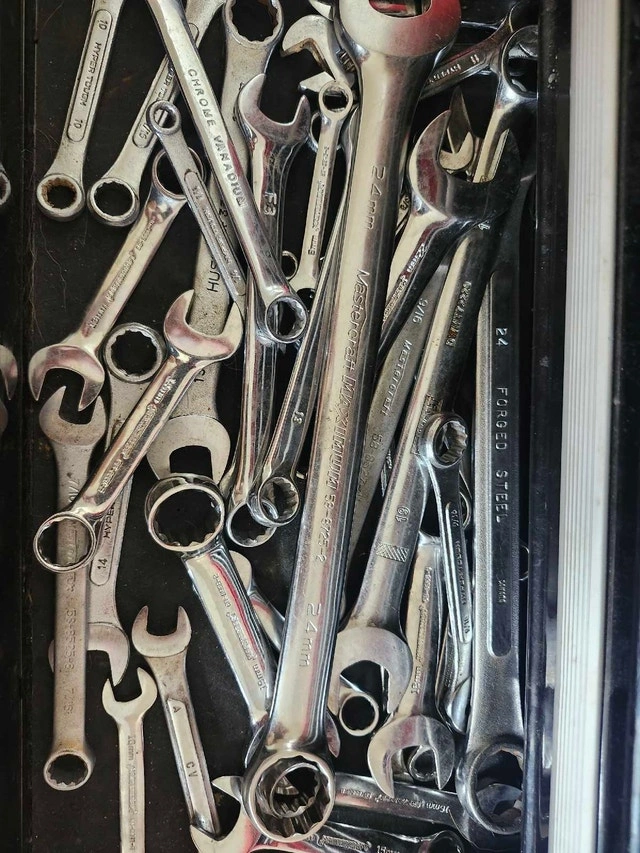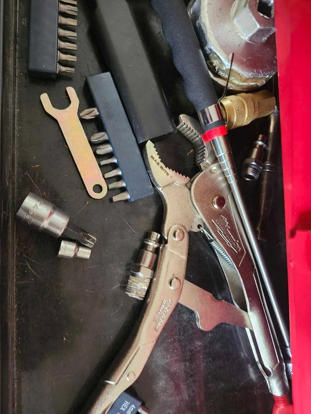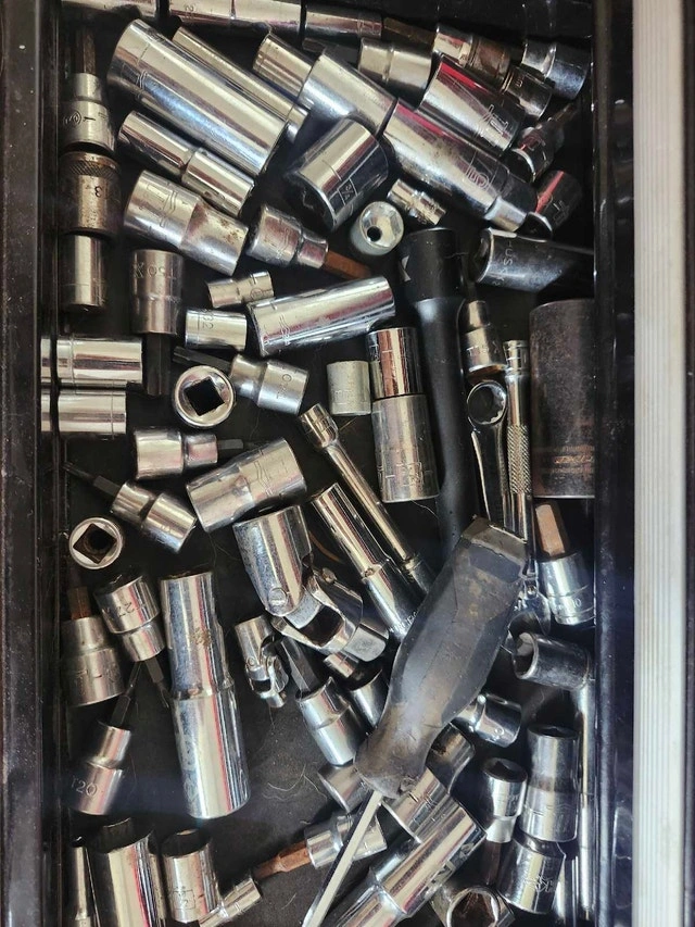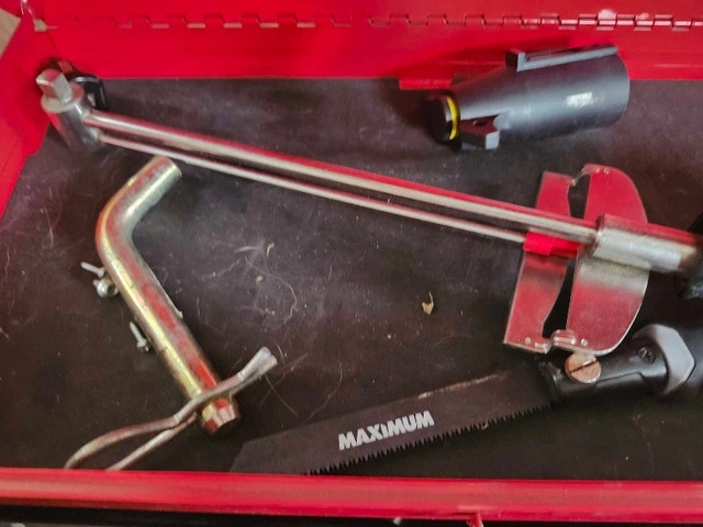 Red metal 4-drawer tool chest. It's filled with various tools including sockets, wrenches, pliers, and a small saw. Some tools have brand markings like "MAXIMUM". For Sale By: Owner.