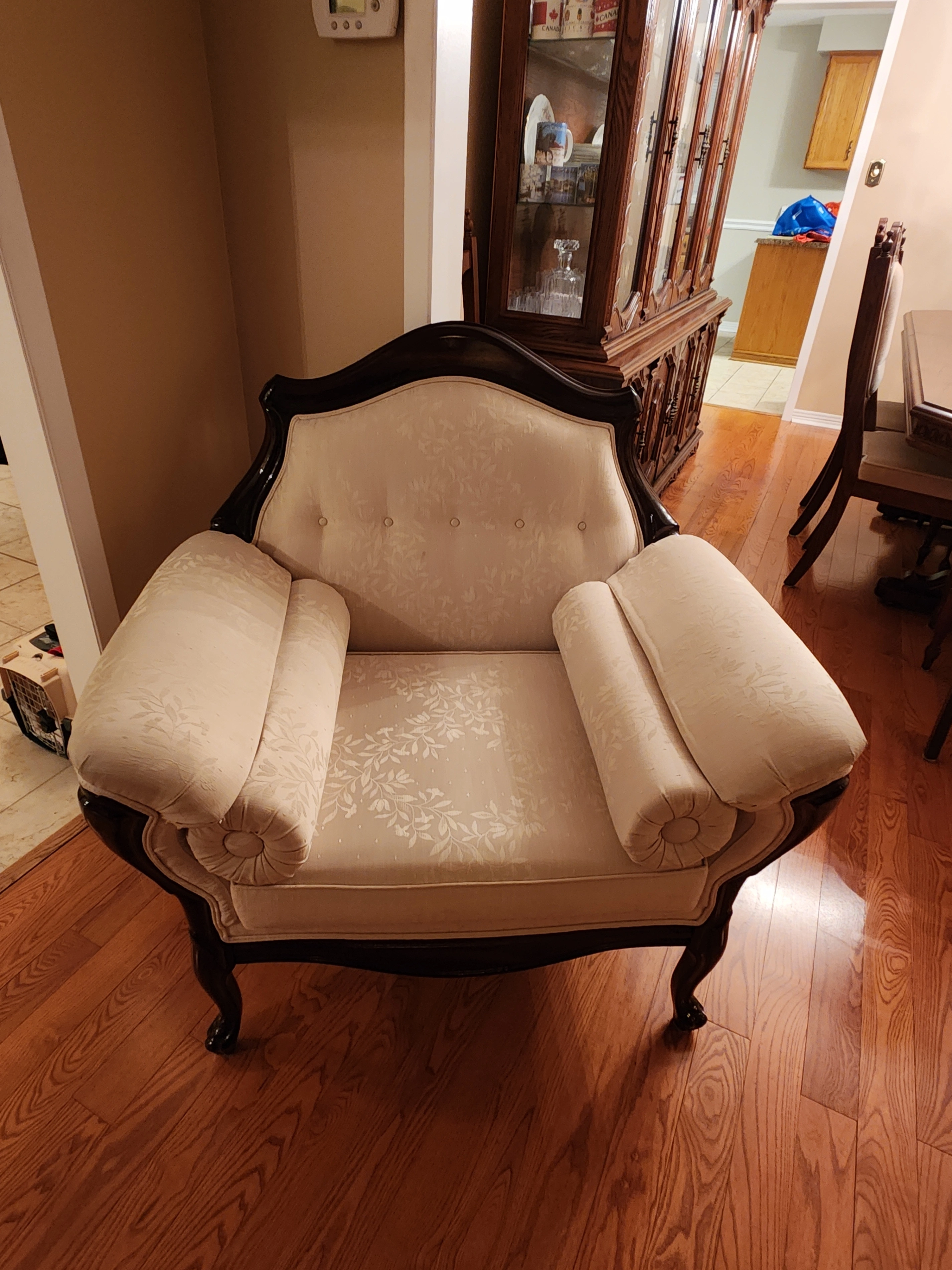 Selling a beautiful antique-style sofa, loveseat, and chair set. The set features a cream-coloured fabric with a subtle floral pattern and dark wood trim. It would look great in any living room!