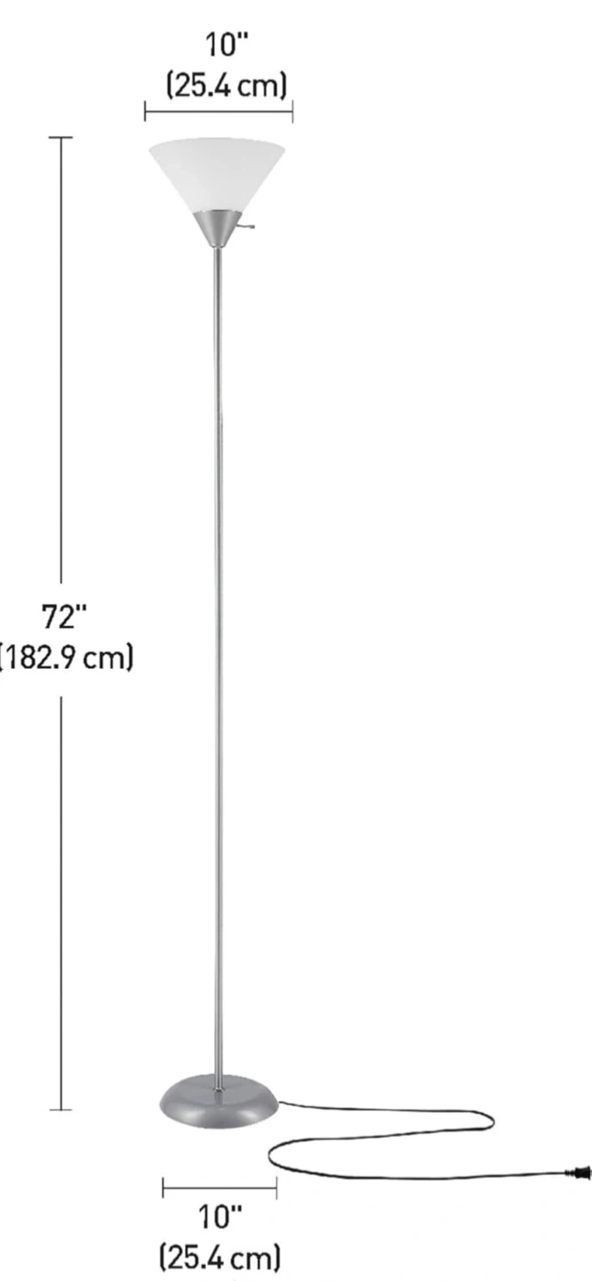 Moving sale! A tall floor lamp, standing 72 inches high. It features a frosted plastic shade and base. The lamp's base measures 10 inches in diameter, and the shade is also 10 inches wide.