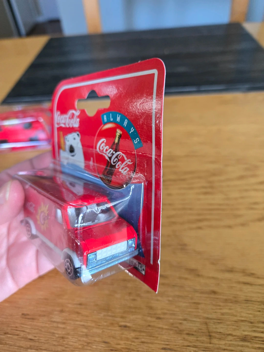 This is a Coca-Cola branded die-cast van toy. It features classic Coca-Cola graphics including the polar bear and the "Always Coca-Cola" slogan. This collectible toy comes in its original packaging.