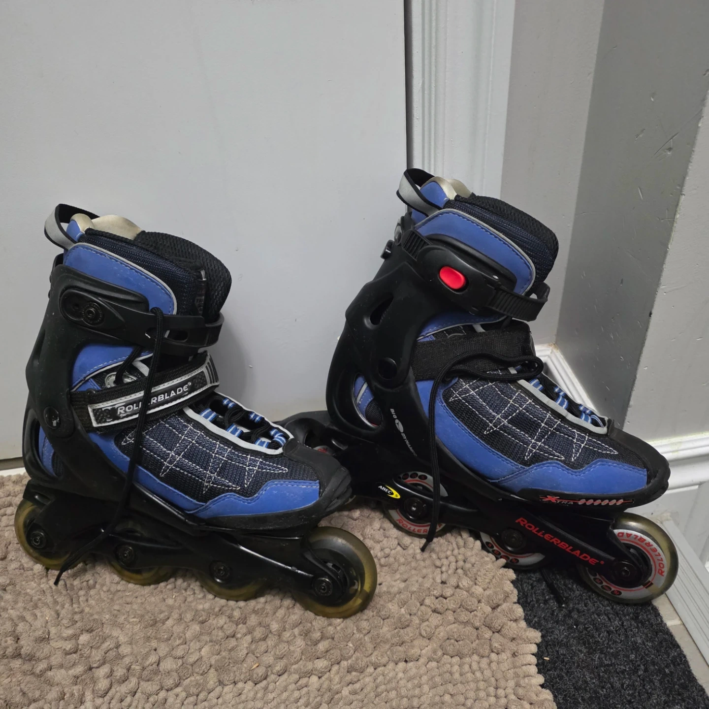 These are blue and black Rollerblade inline skates. They're marked as M24.0, EU38, and US7. Made in China. Size 7 for usa