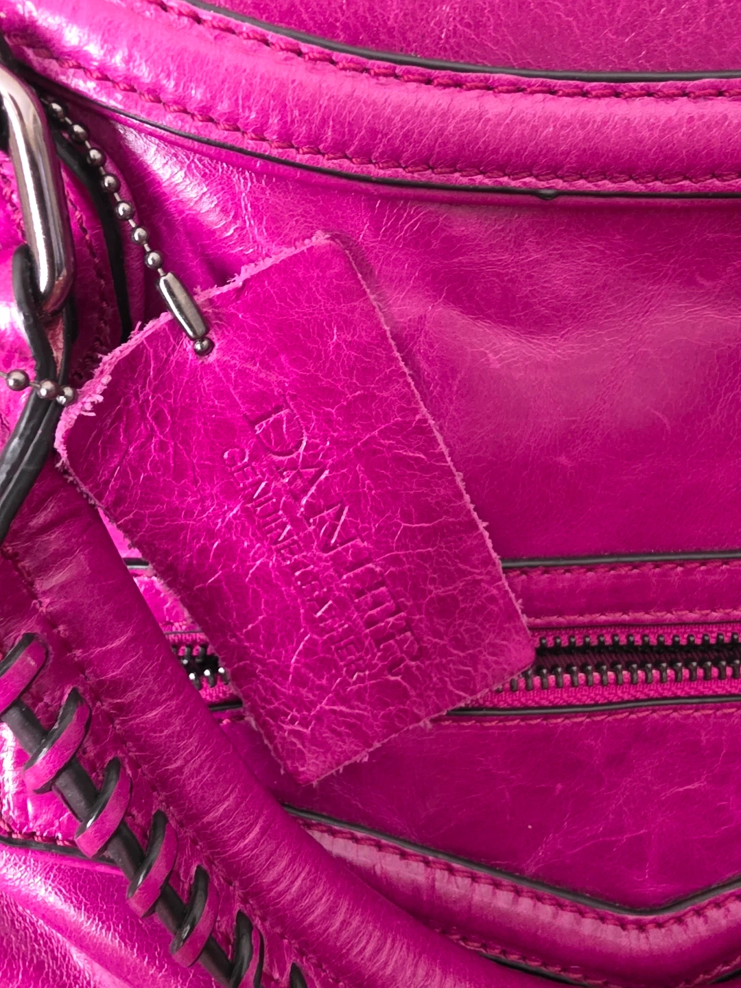 This is a vibrant magenta genuine leather satchel handbag from Danier. It features a braided detail on the handles and a zippered front pocket. The leather has a distressed finish and it includes a detachable shoulder strap.