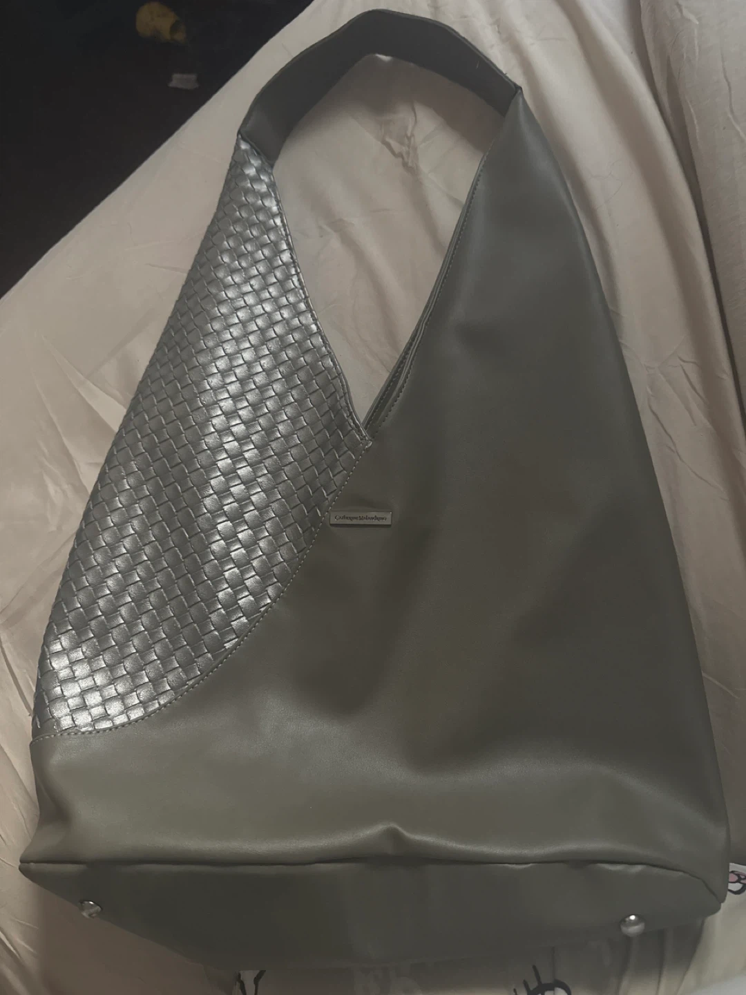 This hobo handbag features a unique woven silver panel. It's made of a smooth grey faux leather material. This bag offers a stylish look for everyday use!