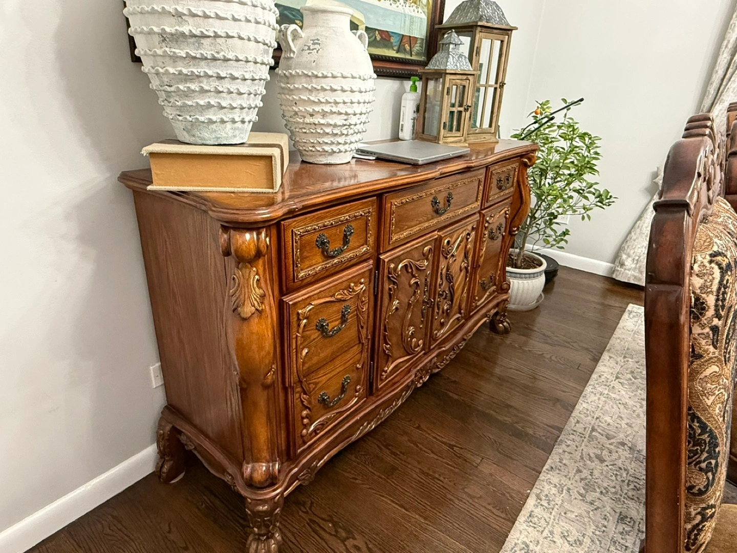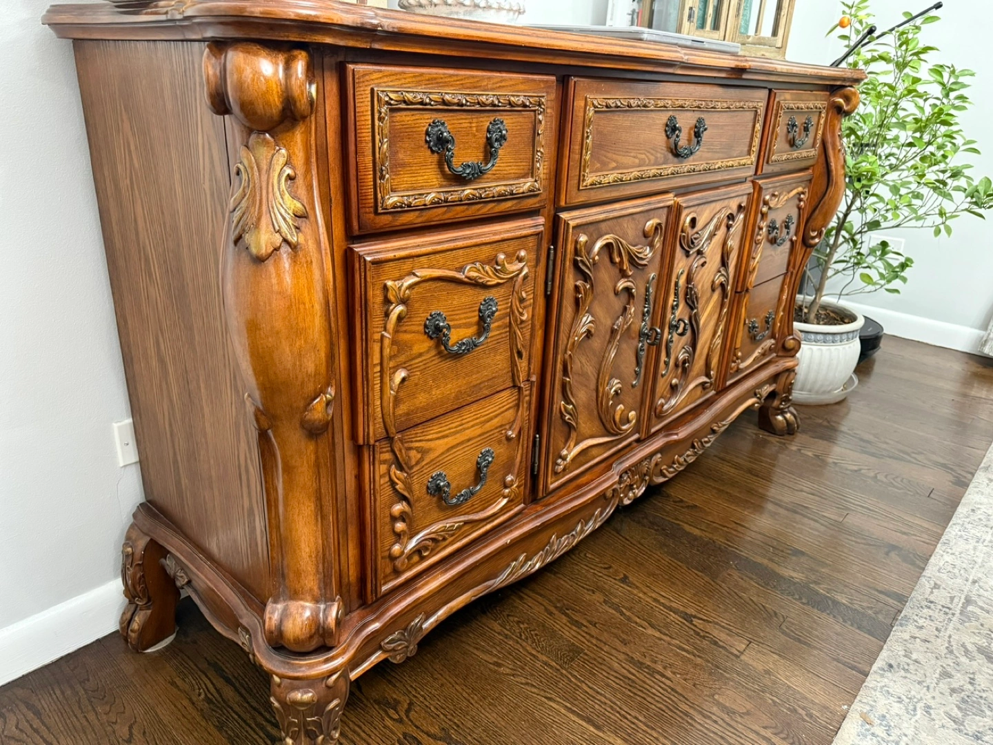 Beautiful ornate wood dresser/buffet with lots of storage! It's in great condition and would look great in any home.